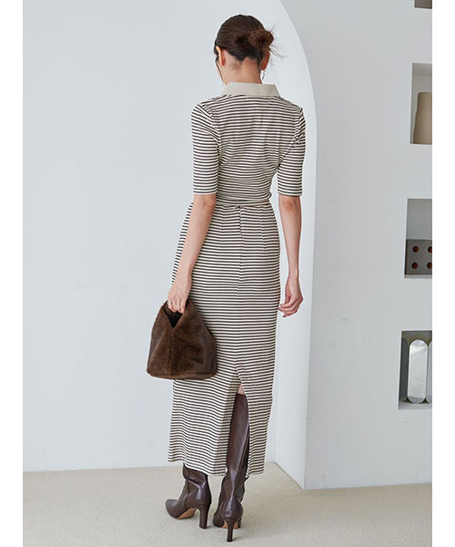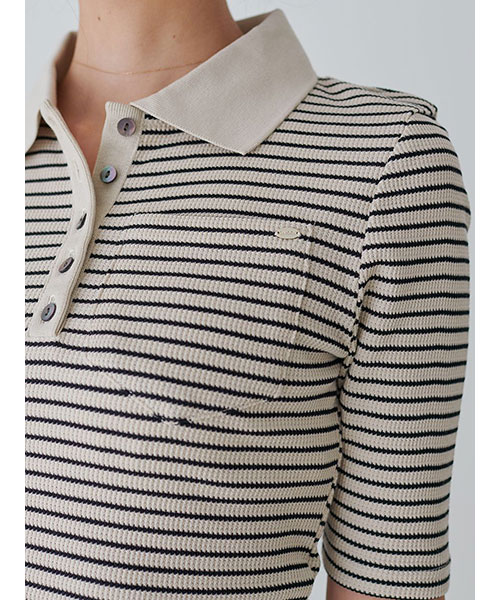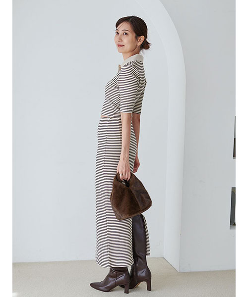 凹凸感のあるワッフル素材を使用し、軽やかで肌離れの良い着心地を実現。トップスの衿・前立て、スカートのウエスト内側には別編みの生地を採用し、型崩れしにくくしっかりとした仕立てに。アイボリー、ネイビー、ブラウン、ブラックの4色展開で、シーズンを通して着まわしやすいベーシックカラーが揃っています。