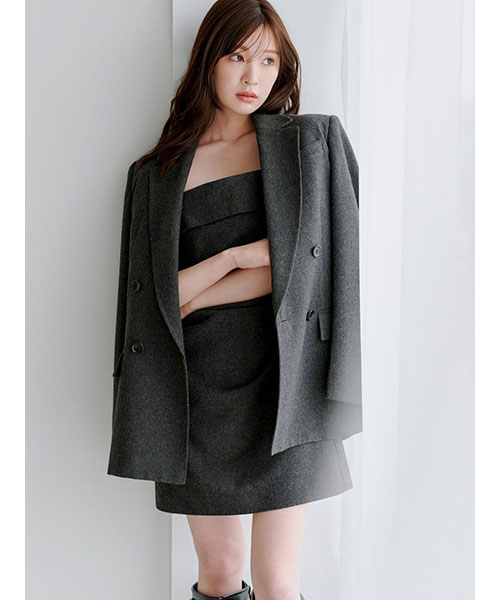 秋ムードを一気に盛り上げる、モードな印象のオーバーサイズダブルジャケットが登場。柔らかなウール混の表情のある生地を使用しています。肩パット入りのボクシーなシルエットはスタイルアップ効果はもちろんのこと、ワンピースやニット×パンツスタイルなど、様々なコーデの上からざっくりと羽織れるのが特徴。襟やポケットのフラップにはさり気ないハンドステッチ風のディティールを施し、上品で仕立ての良いジャケットに仕上げました。セットでお作りしている同色・共地のベアミニワンピース(SWFO254178)との合わせがおすすめです。