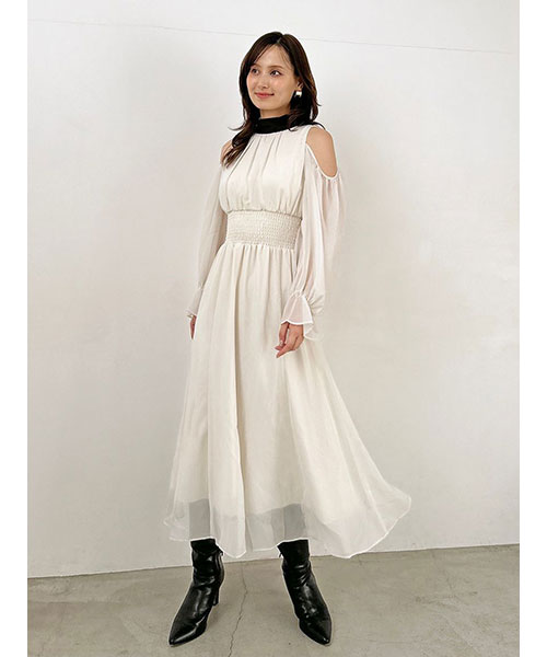 上品な光沢感のある生地に、たっぷりとギャザーを施したドラマティックなコールドショルダーワンピース。肩をさりげなく肌見せするデザインに加え、ベルスリーブや後ろ結びのボウタイが、360度どこから見ても印象的なスタイルを演出します。ウエストはシャーリングで着脱しやすく、ふんわりと揺れるギャザーや、異なるカラー展開がそれぞれの魅力を引き立てる一枚です。