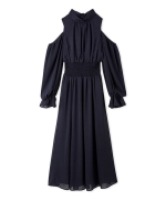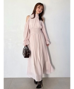 上品な光沢感のある生地に、たっぷりとギャザーを施したドラマティックなコールドショルダーワンピース。肩をさりげなく肌見せするデザインに加え、ベルスリーブや後ろ結びのボウタイが、360度どこから見ても印象的なスタイルを演出します。ウエストはシャーリングで着脱しやすく、ふんわりと揺れるギャザーや、異なるカラー展開がそれぞれの魅力を引き立てる一枚です。