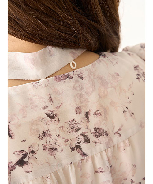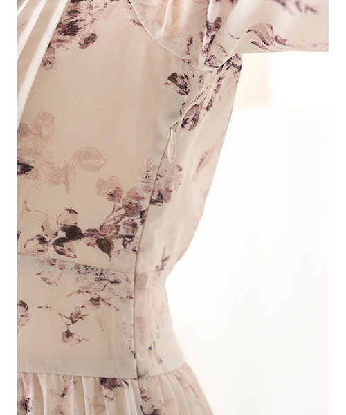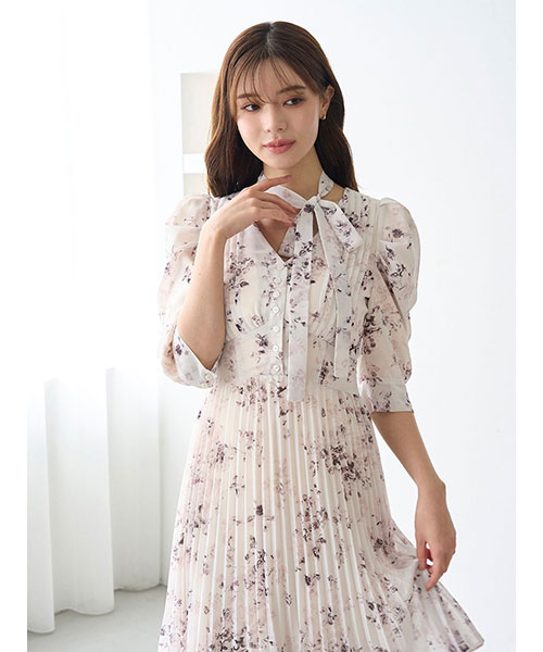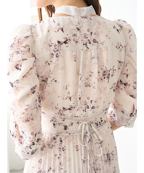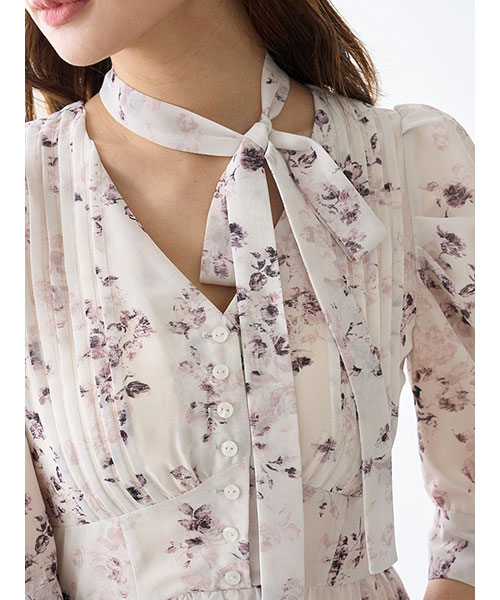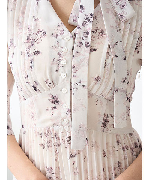 小粒の薔薇モチーフのかすれ柄プリントを取り入れた大人ロマンティックなプリーツシフォンワンピースが登場。共布のボウタイ付きで、後ろのボタンでボウタイの取り外しができるので自由にアレンジいただけます。ワンピースは深めのV開きで抜け感を出しつつ、トップは小粒のボタンとピンタックデザインをプラスしてきちんと感をプラス。軽やかで柔らかな生地を使用してふんわと仕上げていますが、ウエストで切り替えを入れてメリハリを出して美シルエットな仕上がりです。スカート部分はプリーツ加工を施し、ふわっと広がるティアード仕立てで華やかに。袖口にはタックを入れてエレガントな印象です。背中側のウエスト位置にはゴムシャーリングを施してフィット感を出し、リボンをプラスしているのでシルエットを微調節いただけます。サイドのファスナーで着脱いただけます。裏地付きです。