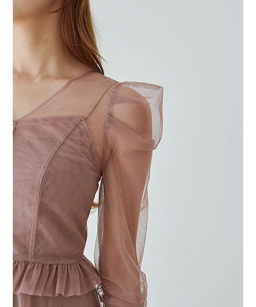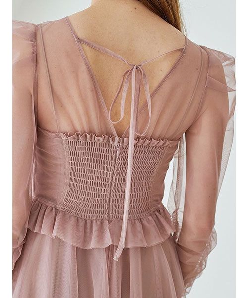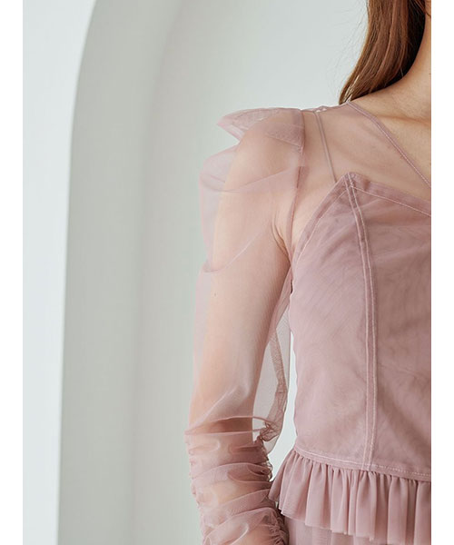 ホリデーシーズンを盛り上げる、柔らかく繊細なシアー感のある生地をたっぷりと使用した透明感のあるチュールドレスが届きました。Vネックのシアートップスにハートネック風のベア型のシアーインナーをレイヤードしているかのようなドッキングデザインが新鮮。センターにはボタンを添え、ウエスト高め位置にフリル切り替えを施してスタイルアップ効果も抜群です。スカート部分はアシンメトリなティアードデザインがふわっと広がり、歩くたびに揺れて表情も華やか。パワーショルダーでエレガントに、袖口はギャザーでクシュっとさせてアクセントを入れました。ドレッシーなアイテムですが、ミニジャケットなどを合わせて着て頂くと、お食事シーンなどでもお使いいただけます。背中側にはたっぷりとゴムシャーリングを加え、フィット感を出しました。伸縮性のあるシアーチュールを使用しているので着心地の良いアイテムです。背中側のファスナーで着脱いただけます。裏地付きです。
