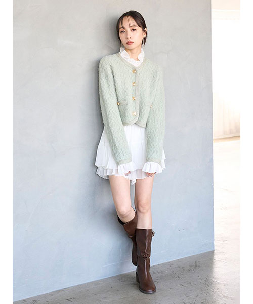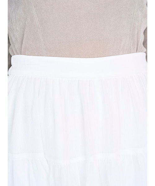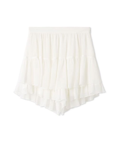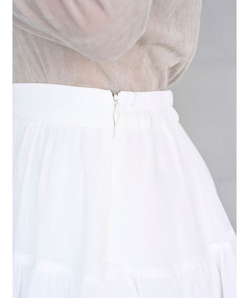 たっぷりとボリュームを出したデザインに、柔らかく凹凸感のある楊柳生地を採用することで華やかなニュアンスをプラスしたスカートショーパンアイテム。リップルライン=波立つような流れるライン・シルエットが印象的です。ラッフルのフレアを細かく計算してパターンに落とし込むことで、動く度に華やかにフリルが流れます。同色・共生地展開のリップルラインブラウス(SWFB255026)とのコーディネートもおすすめ。シンプルかつ軽やかなデザインで、ファーライクロングニットジャケット(SWNJ255146)とのスタイリングもおすすめです。後ろがゴム入りなのでフィット感をプラスし、着心地良く仕上げました。サイドのファスナーで着脱いただけます。別品番で同デザインのレース刺繍生地ver.のチュールエンブロイダリーレースBL(SWFB255147)も展開しています。)