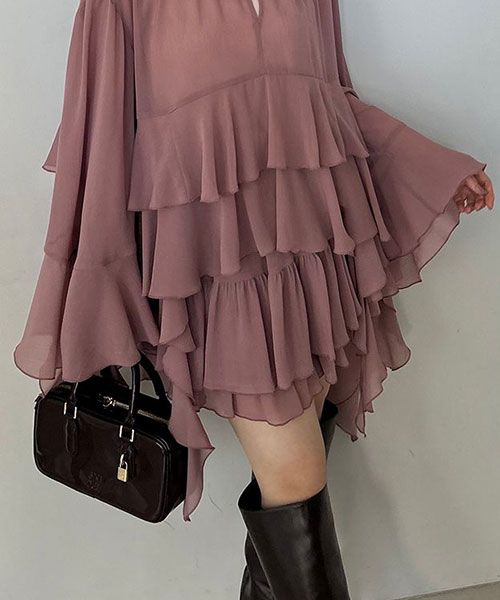 たっぷりとボリュームを出したデザインに、柔らかく凹凸感のある楊柳生地を採用することで華やかなニュアンスをプラスしたスカートショーパンアイテム。リップルライン=波立つような流れるライン・シルエットが印象的です。ラッフルのフレアを細かく計算してパターンに落とし込むことで、動く度に華やかにフリルが流れます。同色・共生地展開のリップルラインブラウス(SWFB255026)とのコーディネートもおすすめ。シンプルかつ軽やかなデザインで、ファーライクロングニットジャケット(SWNJ255146)とのスタイリングもおすすめです。後ろがゴム入りなのでフィット感をプラスし、着心地良く仕上げました。サイドのファスナーで着脱いただけます。別品番で同デザインのレース刺繍生地ver.のチュールエンブロイダリーレースBL(SWFB255147)も展開しています。)