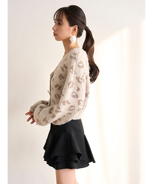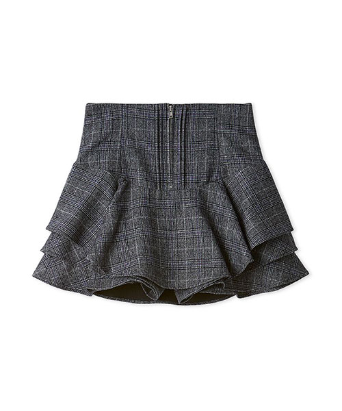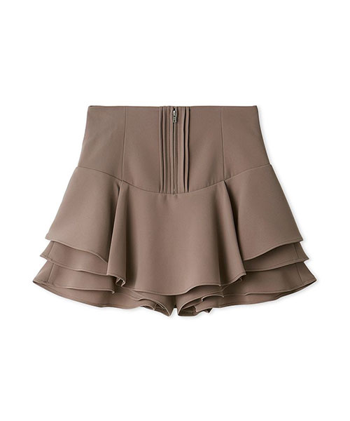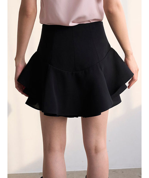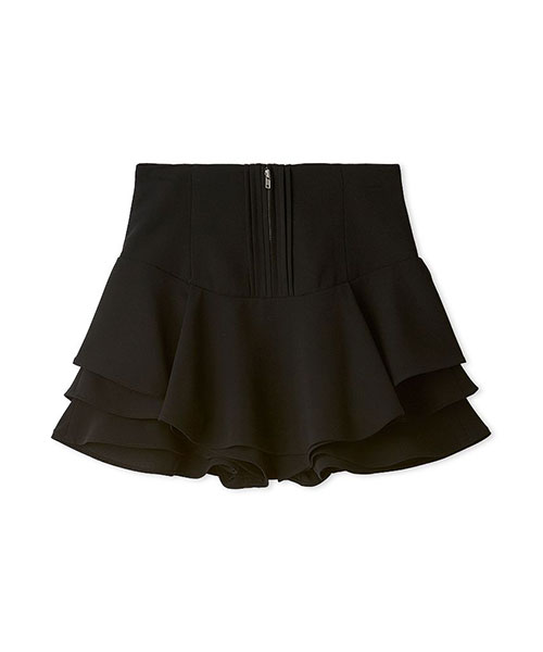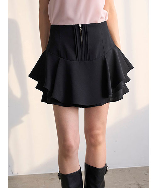 裾に立体感のあるフリルをあしらって動きを出したトレンド感のあるレイヤードフリルミニスカショーパンです。腰回りはすっきりとさせ、裾に向かって構築的に広がるヘムラインがひらひらと揺れてスペシャルな1枚です。フロントにはピンタックとジップを加えてモード感をプラス。立体感のあるシルエットでスタイルアップ効果も抜群です。内側はショートパンツ仕様になっているため安心してご着用いただけます。