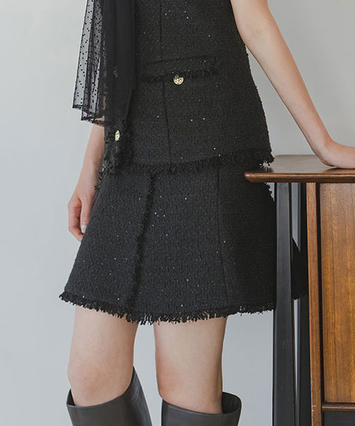 エレガントなツイード生地でお作りしたSNIDELで人気のフレア型ミニスカートです。ほんのり長めの膝上丈ミニスカートで、大人も履きやすいデザインに。カラーにより異なるツイード生地を使用しています。裾やウエストベルト位置、切り替えにさり気ないフリンジカットを施してクラシカルな中にも華やかさをプラスしました。左ウエスト位置にはゴールドボタンを添えて上品なアクセントに。サイドのファスナーで着脱いただけます。ツイードジレ(SWFV254161)と同素材でお作りしており、セットでのご着用もおすすめです。