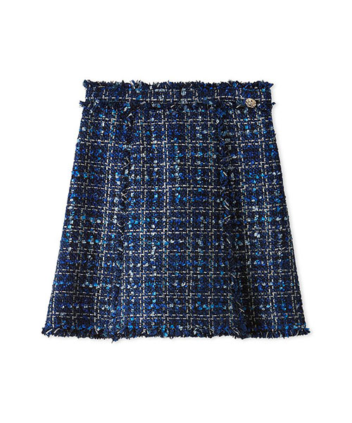 エレガントなツイード生地でお作りしたSNIDELで人気のフレア型ミニスカートです。ほんのり長めの膝上丈ミニスカートで、大人も履きやすいデザインに。カラーにより異なるツイード生地を使用しています。裾やウエストベルト位置、切り替えにさり気ないフリンジカットを施してクラシカルな中にも華やかさをプラスしました。左ウエスト位置にはゴールドボタンを添えて上品なアクセントに。サイドのファスナーで着脱いただけます。ツイードジレ(SWFV254161)と同素材でお作りしており、セットでのご着用もおすすめです。