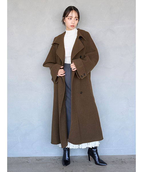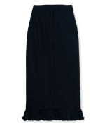 スーツ生地でお作りしたクラシカルなロング丈のナロースカートの裾から見えるランダムプリーツがフェミニンな、プリーツドッキングナロースカートです。ボディラインをすっきりと見せるナローシルエットでお作りしました。バックには深くスリットを入れ、スリットや裾から透け感と光沢感のある美しいオーガンジー生地のランダムプリーツが軽やかに揺れるデザインです。フロントのホックとファスナーで着脱いただけます。ロング丈ですが軽やかで、冬コーデに抜け感をプラスします。ブーツ合わせもおすすめです。サイドにポケットが付いています。