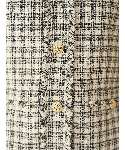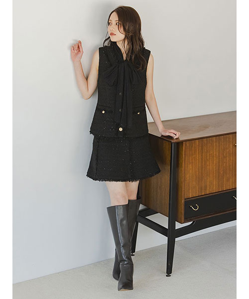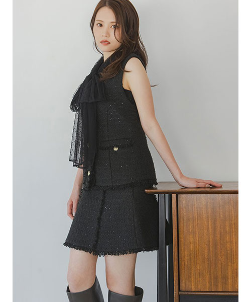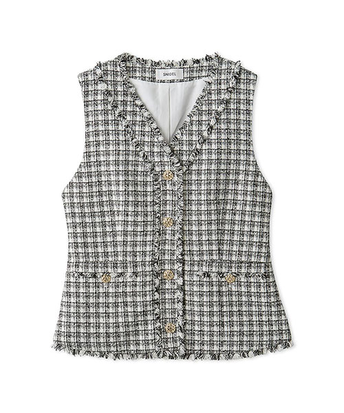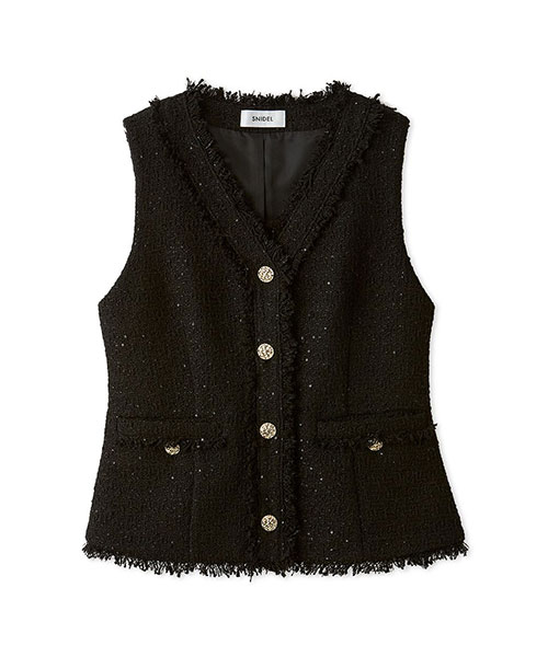 上品ツイード生地でお作りしたSNIDELで定番人気のツイードジレが今季も登場。スカートとのバランスが取りやすいように、普段より丈は少しだけ短くデザインしました。カラーにより異なるツイード生地を使用していますが、普段使いしやすいカラーリングで揃えています。襟ぐりや前立て、フェイクポケット位置にさり気ないフリンジカットを施してクラシカルな中にも華やかさをプラス。特別感のあるゴールドボタンがリュクスな印象へと導きます。ツイードミニスカート(SWFS254267)と同素材でお作りしており、セットでのご着用もおすすめです。