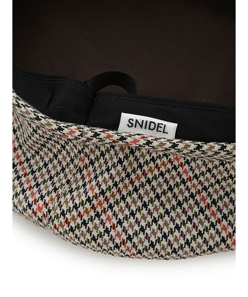 グレーとブラックは合わせやすい無地のウールフェルト生地を、チェックはブラウン・ブラック・オレンジの3色で仕上げた今季らしい千鳥柄の生地を使用し、クラシカルな雰囲気でお作りした3色展開のバリエベレー帽です。グレーとブラックは縁にフェイクレザーバンドを組み合わせて高級感のある仕上がりに。適度のボリューム感で小顔効果も期待できます。内側でサイズ調節も可能です。サイドのSNIDELロゴ刺繍がポイントに。