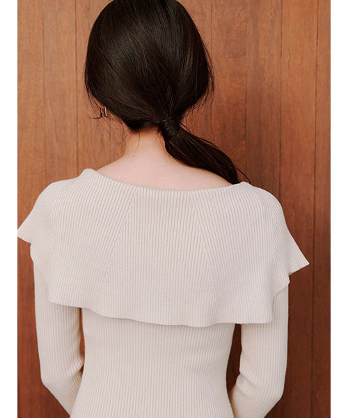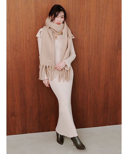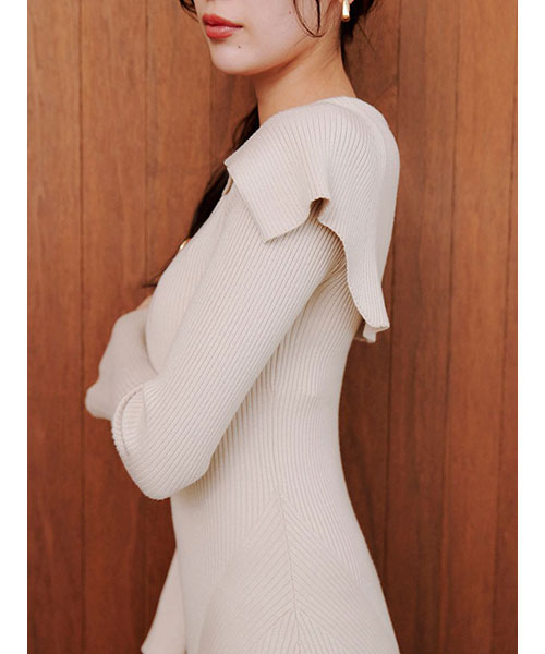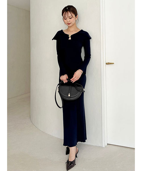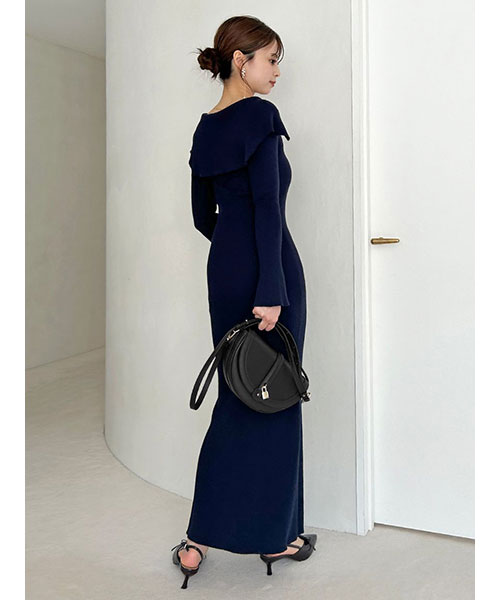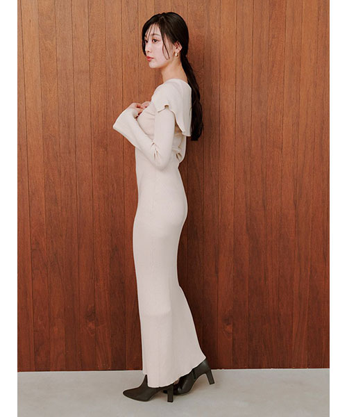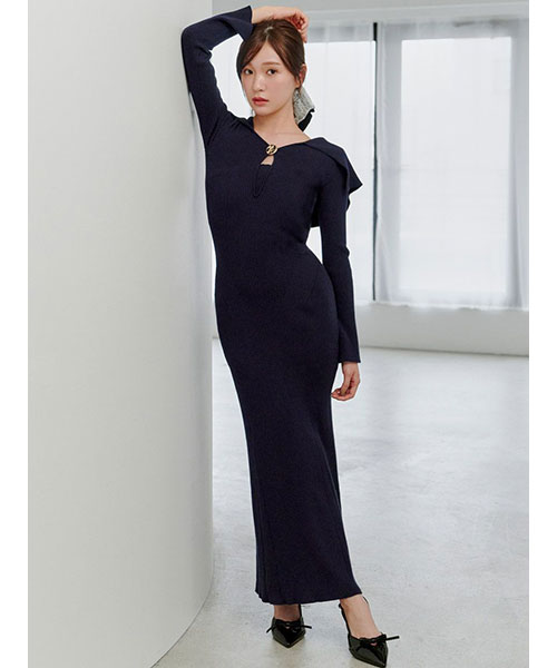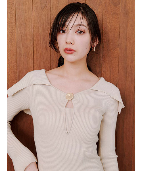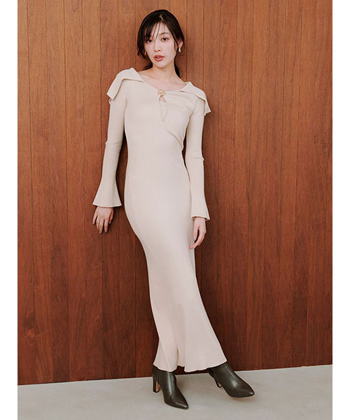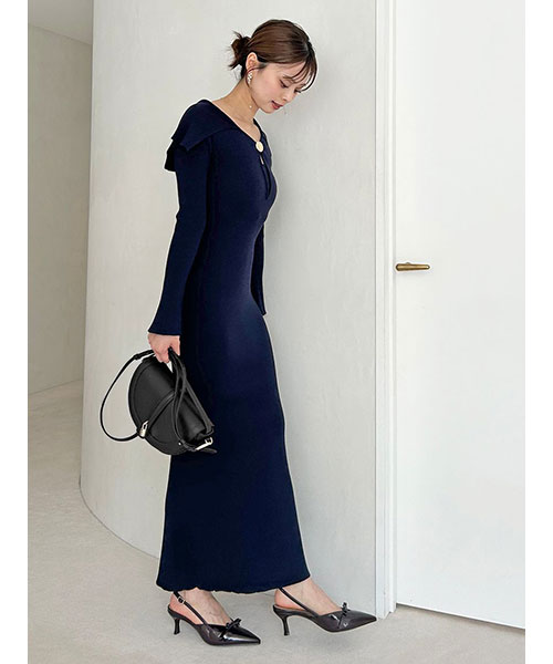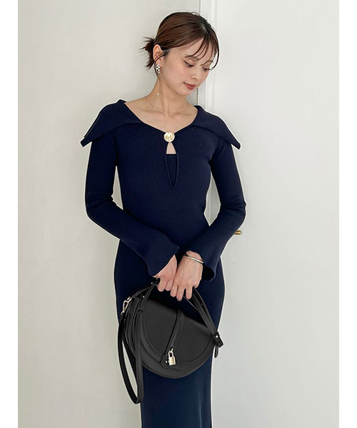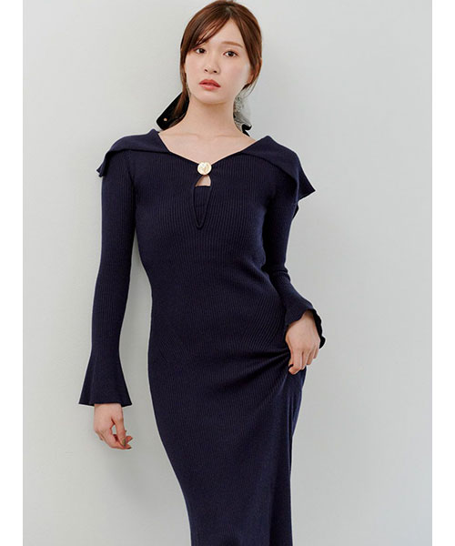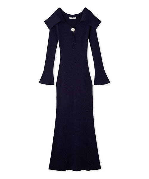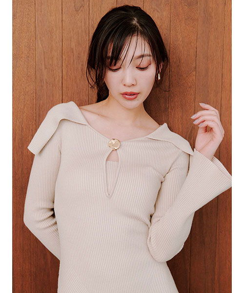顔まわりを華やかに演出するビッグカラーと、胸元のゴールドメタルボタンが目を引く、シンプルながらも洗練されたニットワンピースがお目見え。リブの縦ラインがボディラインをすっきりと見せ、ウエストから裾にかけて自然に広がるマーメイドシルエットでスタイルアップ効果も抜群です。デコルテを美しく見せる胸元のカッティングにもこだわりました。伸縮性のあるニット生地で着心地の良いアイテムです。ボタンは縫い付けられているので被りで着脱いただけます。