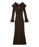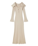 顔まわりを華やかに演出するビッグカラーと、胸元のゴールドメタルボタンが目を引く、シンプルながらも洗練されたニットワンピースがお目見え。リブの縦ラインがボディラインをすっきりと見せ、ウエストから裾にかけて自然に広がるマーメイドシルエットでスタイルアップ効果も抜群です。デコルテを美しく見せる胸元のカッティングにもこだわりました。伸縮性のあるニット生地で着心地の良いアイテムです。ボタンは縫い付けられているので被りで着脱いただけます。