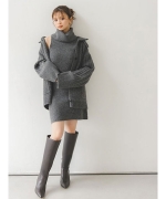 たっぷりとボリュームのあるタートルで、顔まわりを華やかに演出するタートルネックのノースリミニニットワンピースがお目見え。ボディラインに程よくフィットしたリブニットデザインで、ウエスト部分は強調、ヒップ周りはあたり感が出ないようサイズ感を計算して仕上げているので、スタイルアップ効果も抜群です。編地はもっちりと柔らかい糸を使用し、微配色のもく糸同士を組み合わせることで色に奥行きを出しています。同色・共糸を使用しているカーディガン(SWNT254244)との合わせもおすすめ。