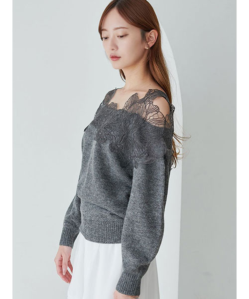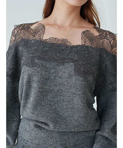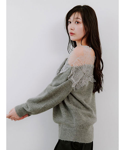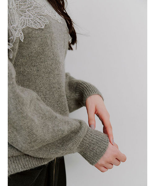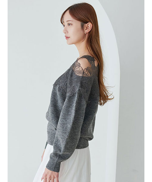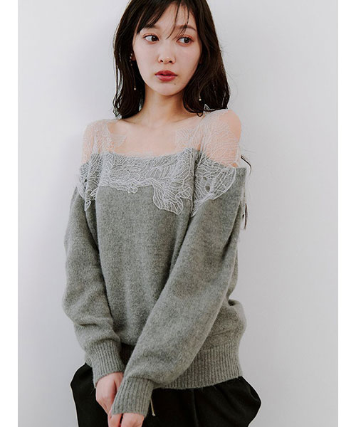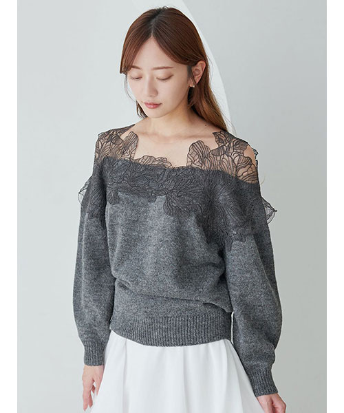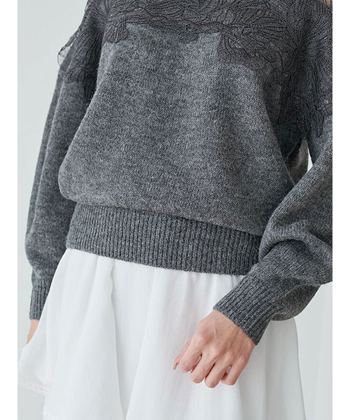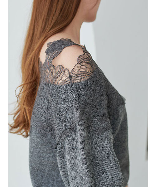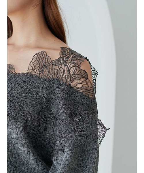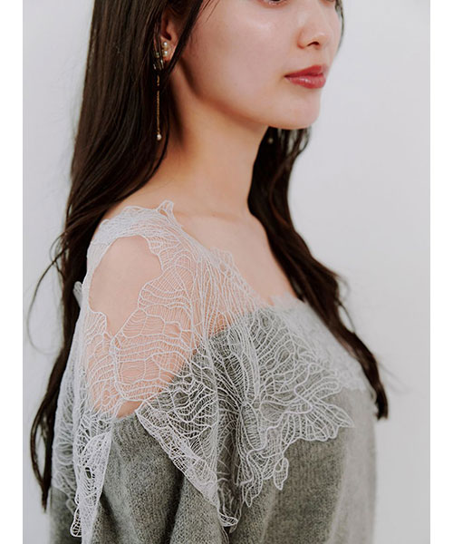 【儚げなリーフ柄レースをデコルテにたっぷりとあしらったニットプルオーバー】【Design/Styling】