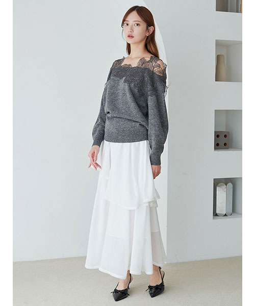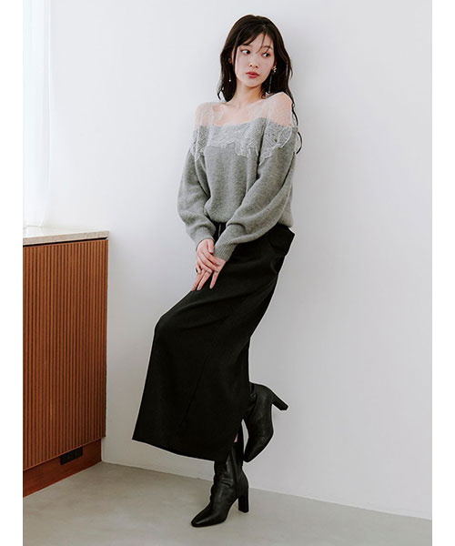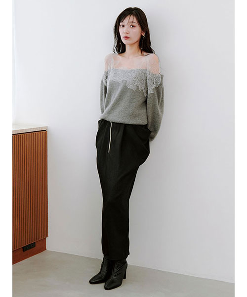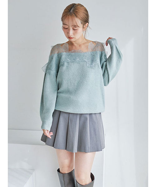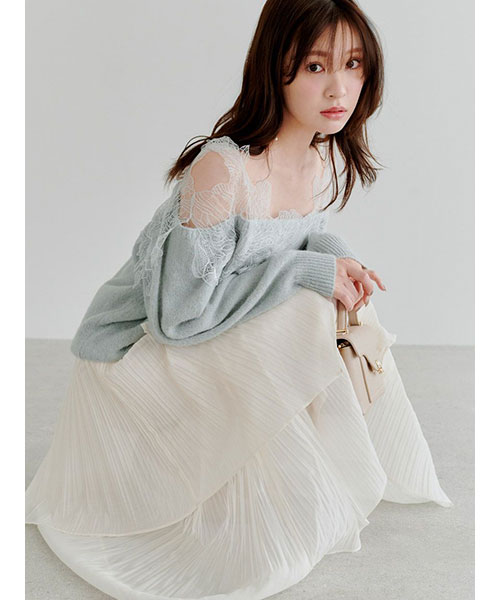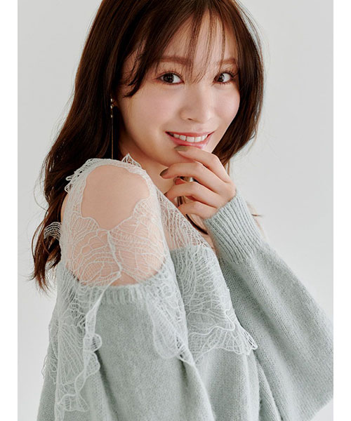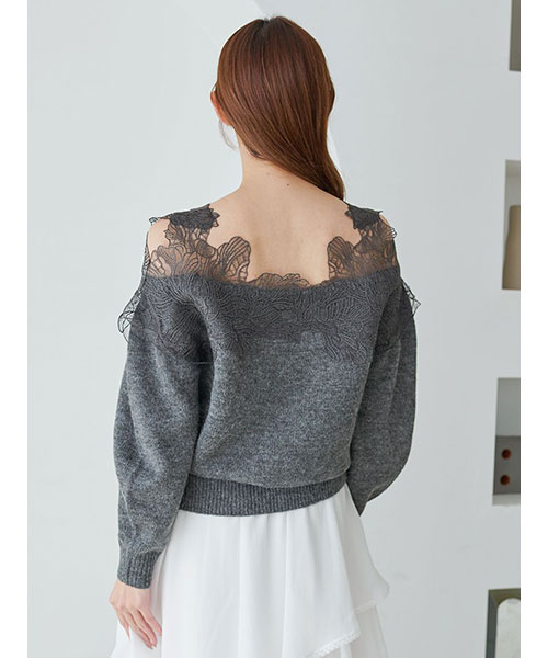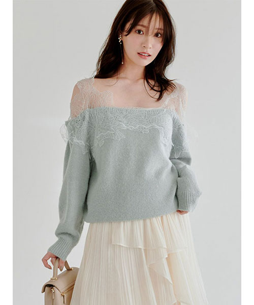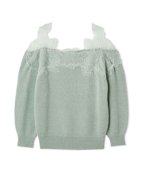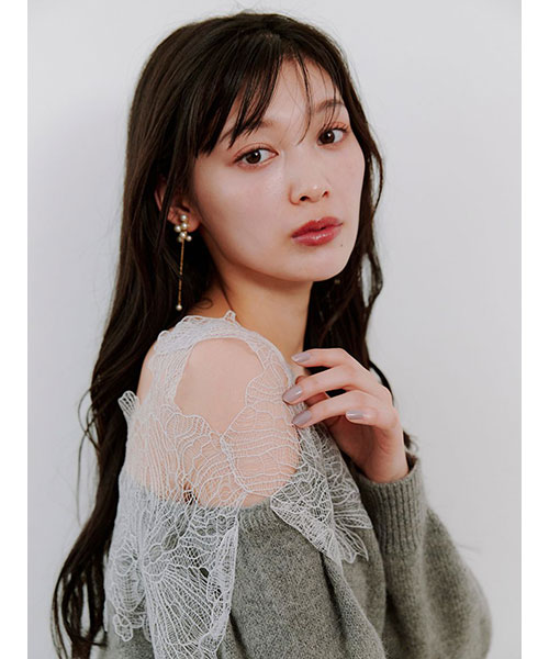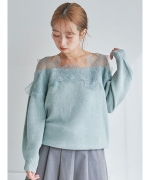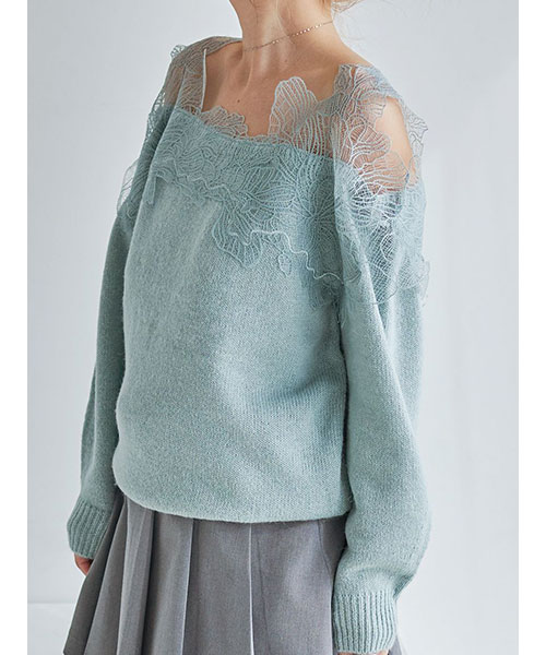 【儚げなリーフ柄レースをデコルテにたっぷりとあしらったニットプルオーバー】【Design/Styling】