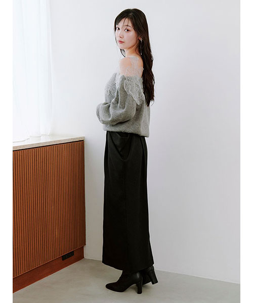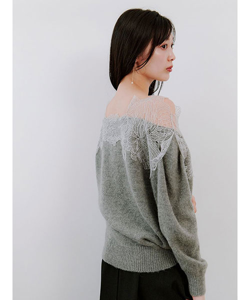 繊細でゴージャスなチュールレースとふんわりニットをドッキングしたレーストリミングニットプルオーバーです。デコルテからショルダーにかけて大胆に施されたリーフ柄レースが繊細な表情に。艶感と透け感のあるレースで、女性らしさを引き立てます。ニット部分には、アルパカとウールを混ぜたふんわり温かなニット生地を使用。ゆったりとしたシルエットで、抜け感のあるスタイリングを叶えます。