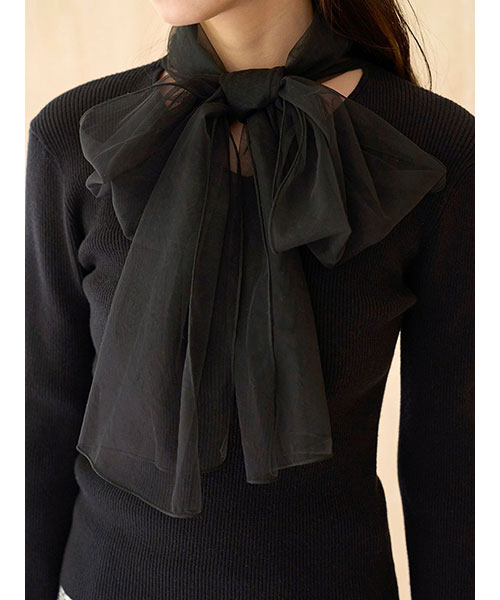太幅のゴージャスで柔らかなチュールリボンを、V開きのリブニットの胸元にドッキングした、主役級ニットプルオーバーです。ふんわりボリューミーなリボンはフロントでも、サイドでも結べるのでコーデに合わせてご調整いただけます。すっきりフィット感のあるキレイめニットは、柔らかで伸びの良い生地を使用しているので着心地の良さも抜群。長袖はベルスリーブで、1枚で着てもサマになるデザインです。