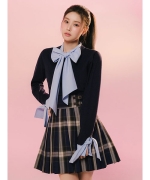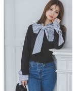 【胸元のシャツ地ビッグリボンが華やかなドッキングニットプルオーバー】【Design/Styling】