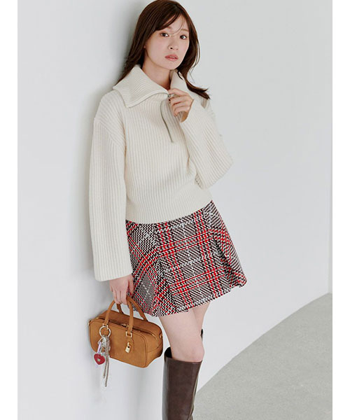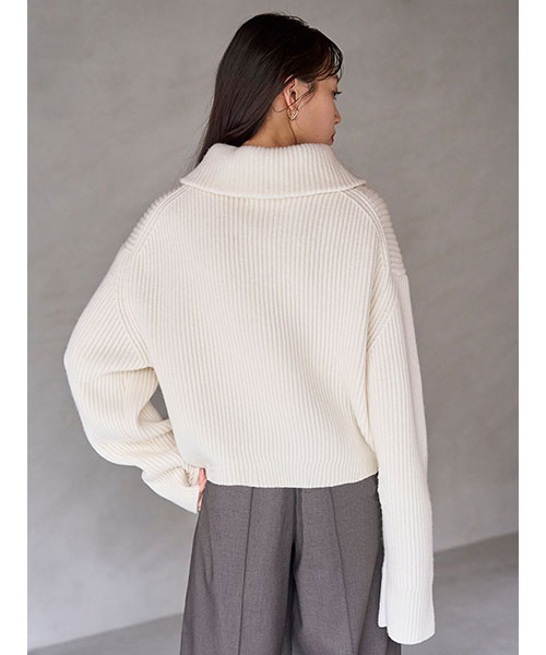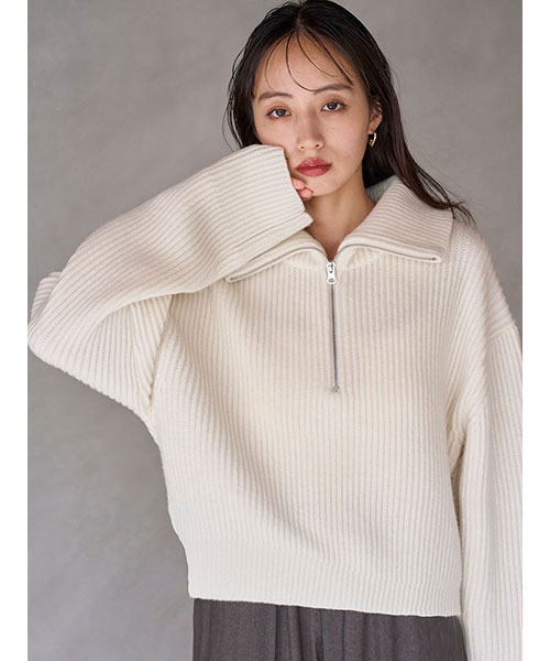 ふっくらとしたウール混の糸を使用した、トレンド感のあるハーフジップニットプルオーバーが完成。立体感のある畦編みのベーシックなフォルムなので、タイトなスカートにもワイドなパンツにも合わせやすく着回し力は抜群。程よく大きな襟が顔まわりを華やかに演出します。着回し力はキープしながらも、リラクシーなフォルムに女性らしい丸みを加え、洗練されたシルエットになるように仕上げました。