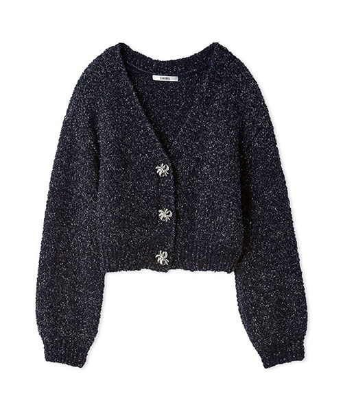【オリジナルビジューボタンが華やかなボリューミーで温かみのあるショート丈のキラキラカーディガン】【Design/Styling】