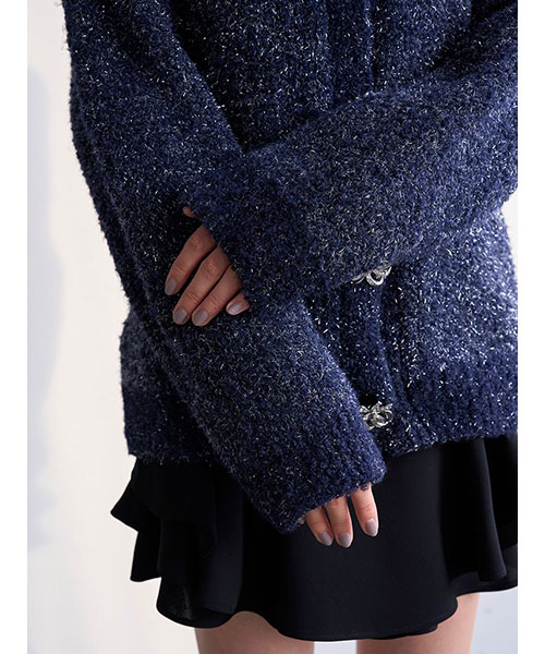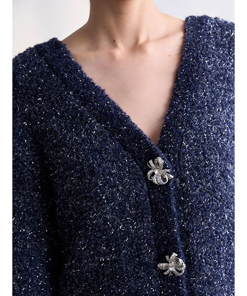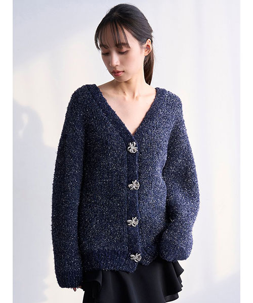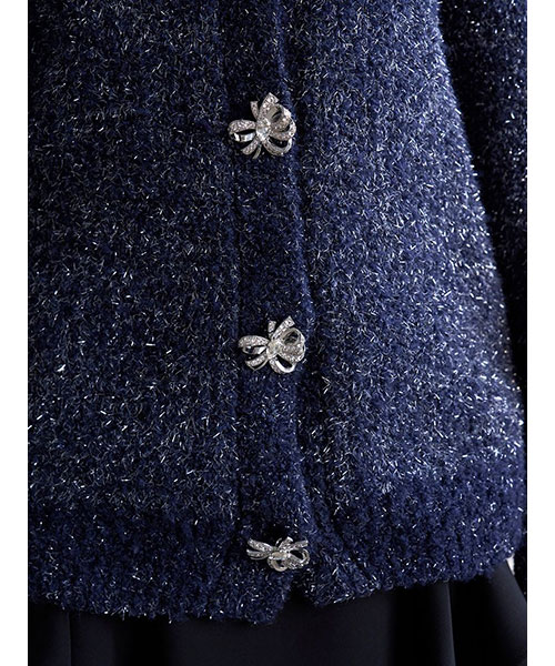 豪華なオリジナルビジューボタンを配置し、キラキラ輝くラメ入りニットでお作りした華やかなビジューリボンショートカーディガン。アルパカ混のふんわりした温かみのある糸を使用し、ジャガード編みでボリュームを持たせた肉厚な編地で仕立てました。存在感のあるビジューボタンは、リボンをモチーフに描き起こしたオリジナルデザイン。肌寒くなってきた時期の羽織りに便利なアイテムです。お尻の隠れるミドル丈で、ざっくりと羽織れて体型カバー力も発揮。パンツスタイルにもワンピーススタイルにも合わせやすいデザインです。ショート丈(SWNT255109)もご用意がございます。