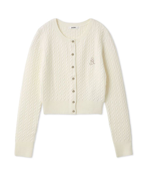 ベーシックで着回しやすいシルエットのケーブルニットカーディガン。胸元にはSNIDELエンブレムの刺繍を施し、さりげないアクセントをプラス。メタルボタンが上品な輝きを添え、シンプルながらも洗練された仕上がりに。羽織としてはもちろん、ボタンを留めてトップス風にも着用可能。オフィスやデイリーなど、幅広いシーンで活躍する万能アイテムです。