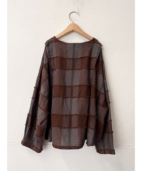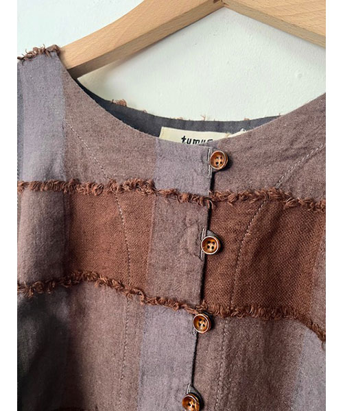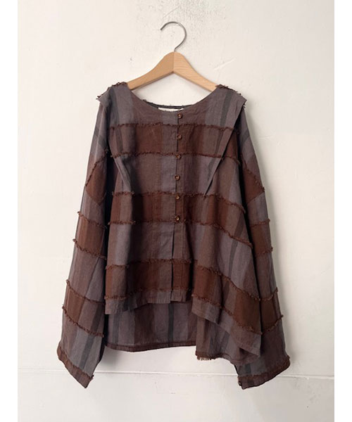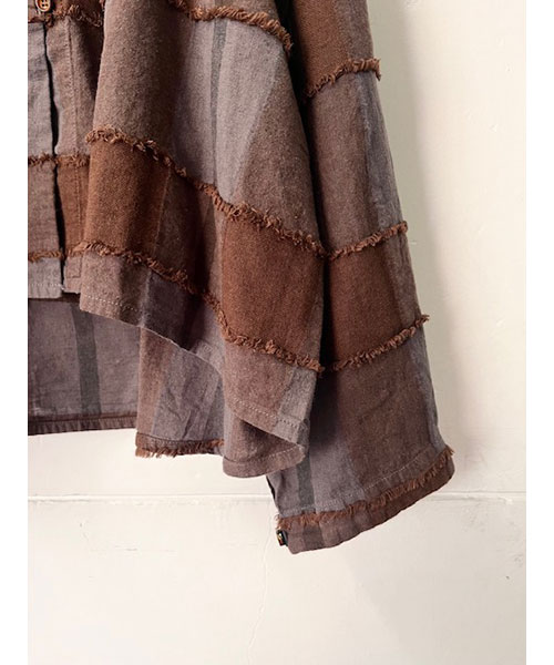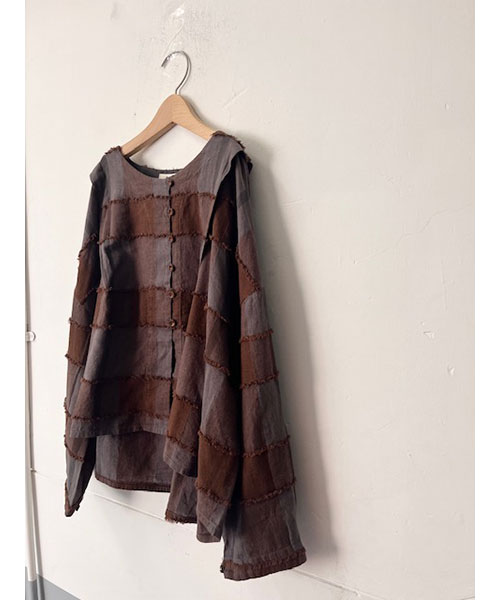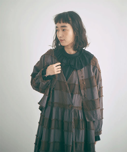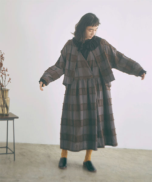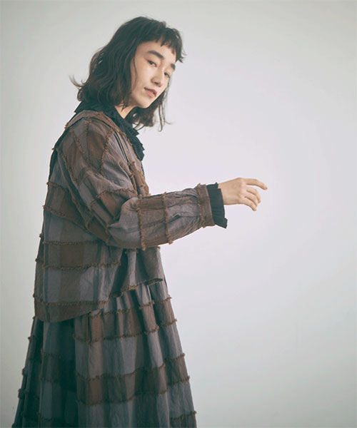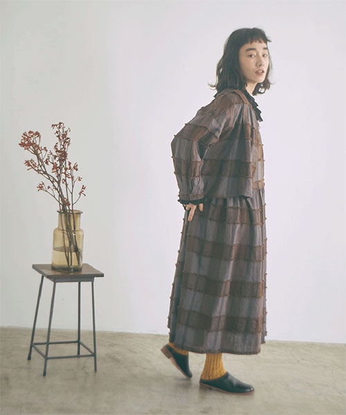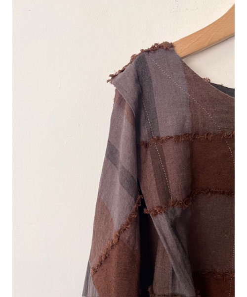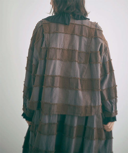 ブロックチェック柄カットジャガード生地で仕立てたボレロブラウス。「カットジャガード」という特殊な技法を施したtumuguのオリジナル生地で作りました。
