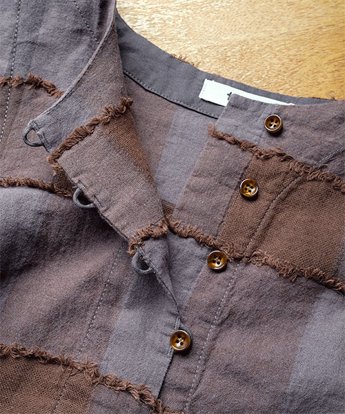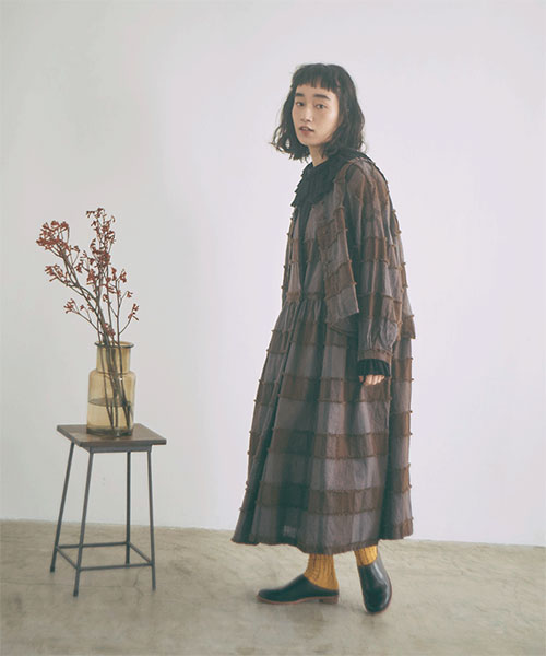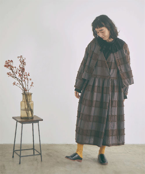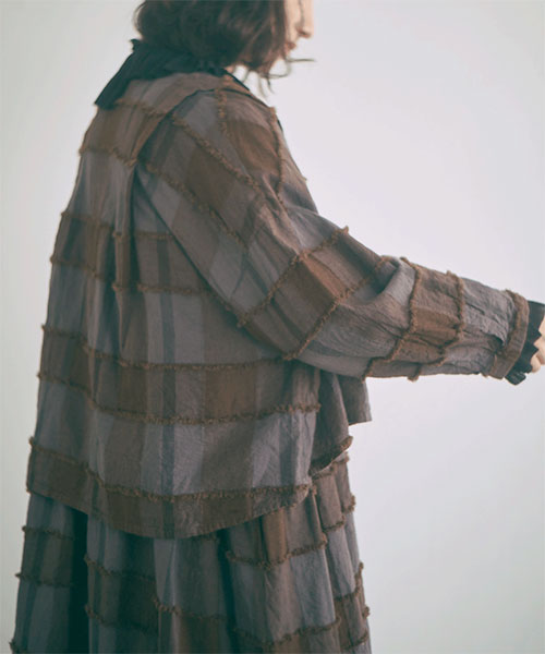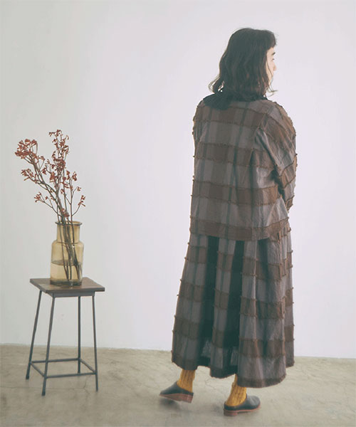 ブロックチェック柄をジャガード織りで表現し、表面に浮き出た糸をカットすることで、フリンジの様な毛羽立ちのある立体感が生まれています。