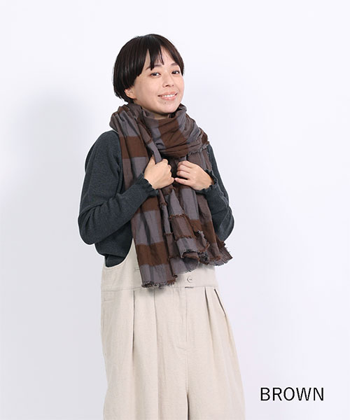 軽やかな素材感と大判サイズで、巻いたり羽織れたりと便利なアイテム。