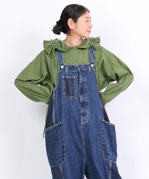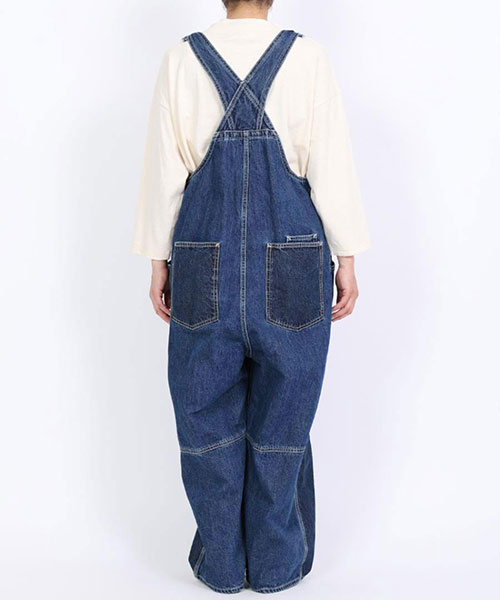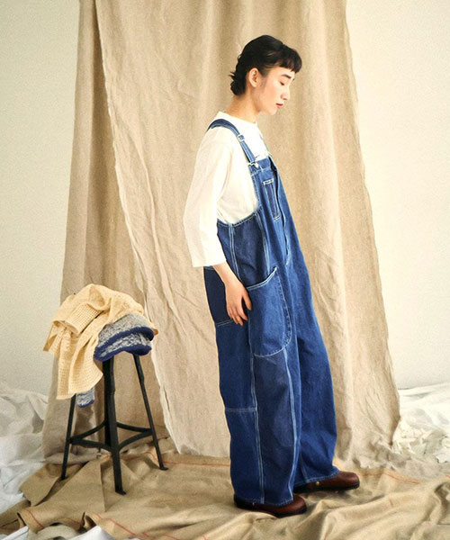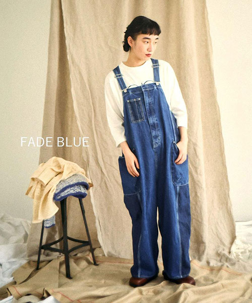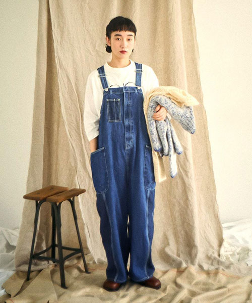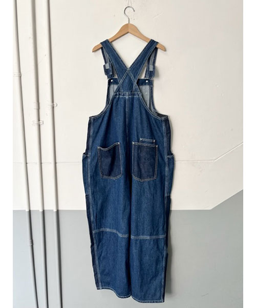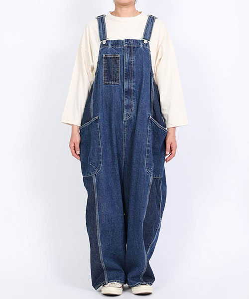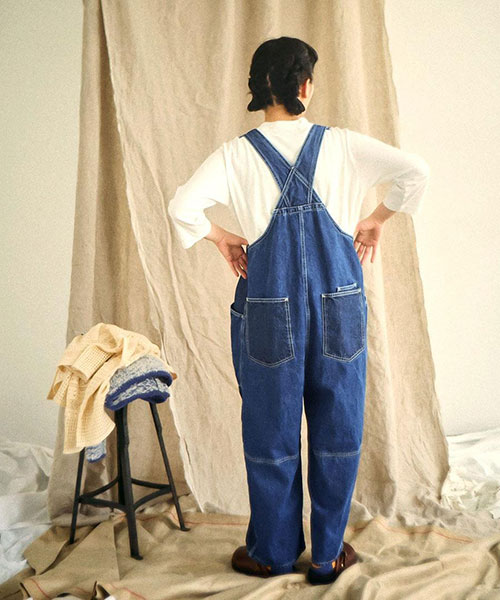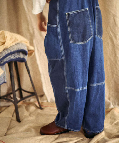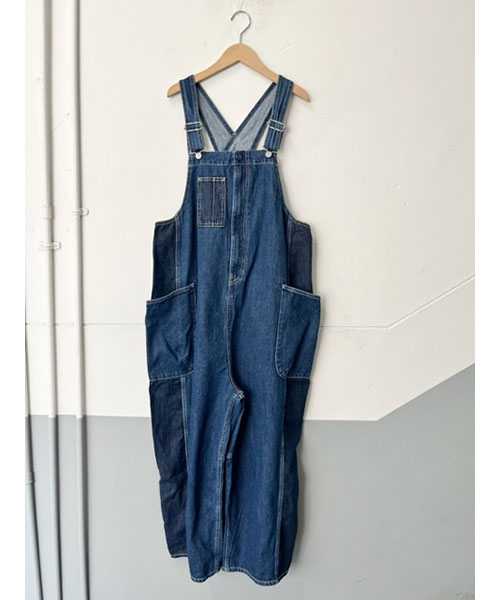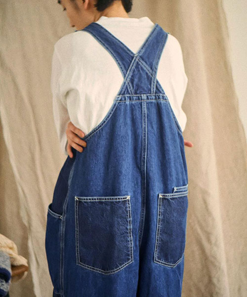 表情豊かな素材と大胆な切り替えが魅力の大人のリラックスサロペット。程よい厚みの10ozデニム生地を使用しています。