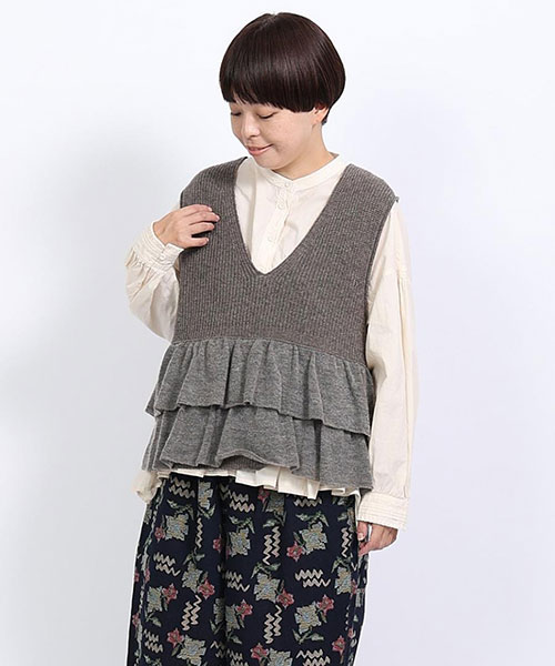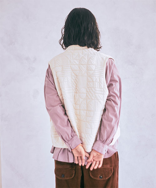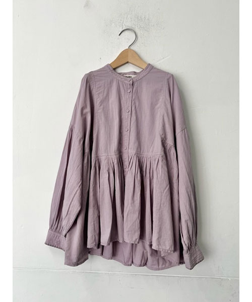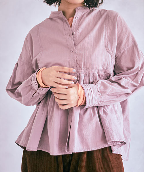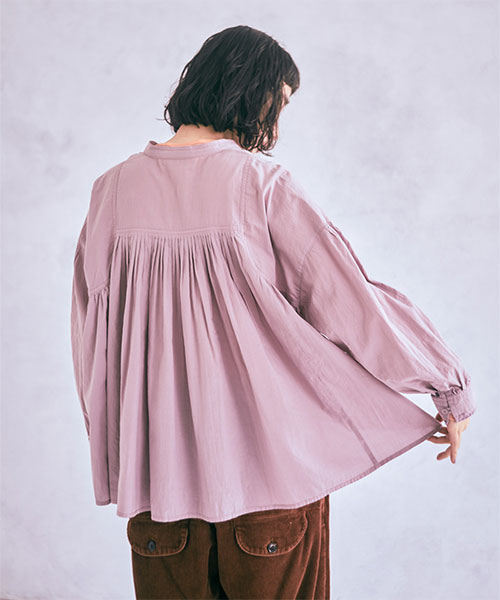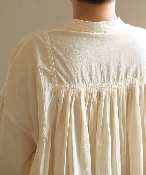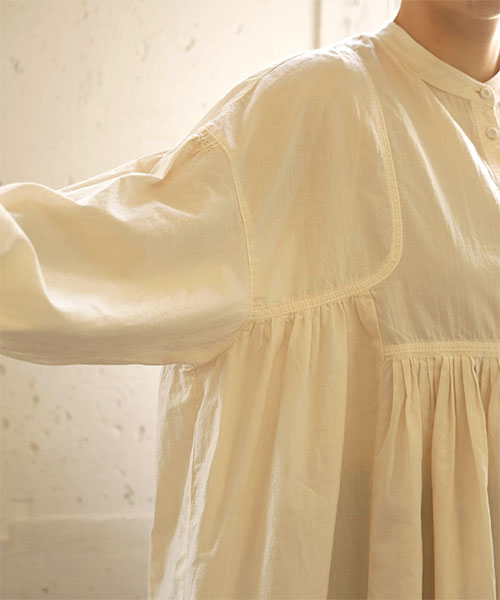 前後のヨーク部分にたっぷりと細かくギャザーを施した華やかなデザイン。