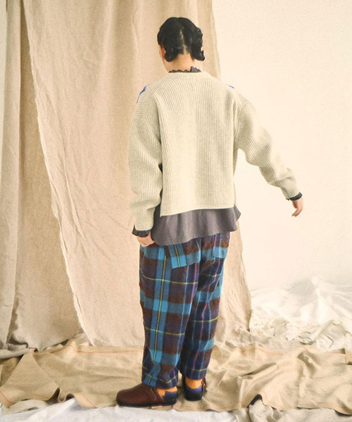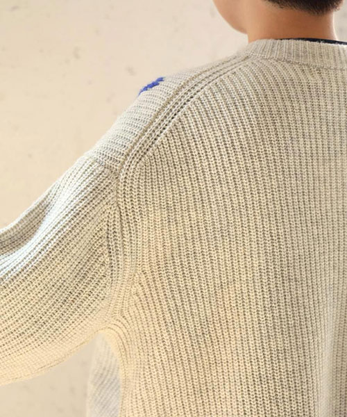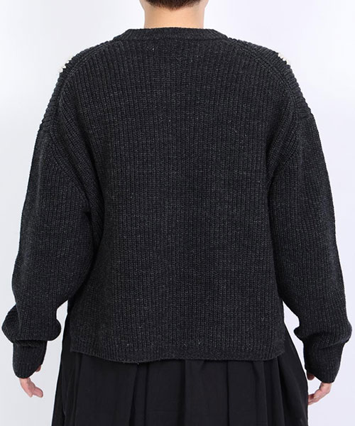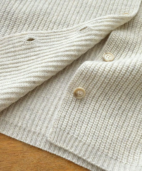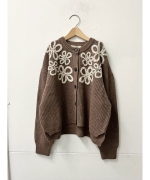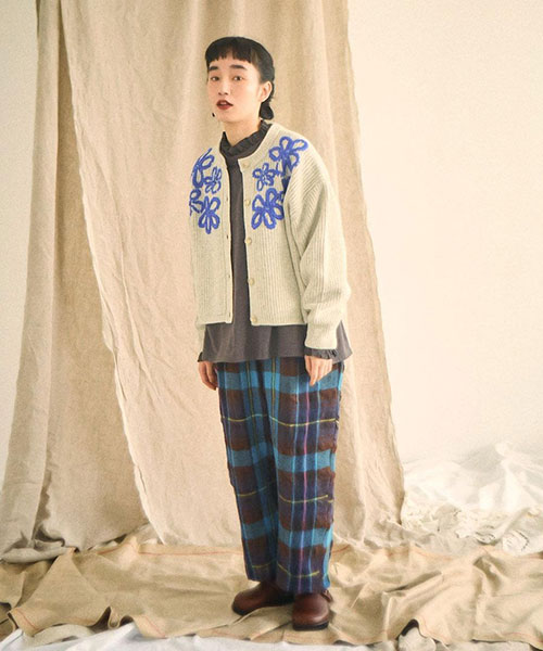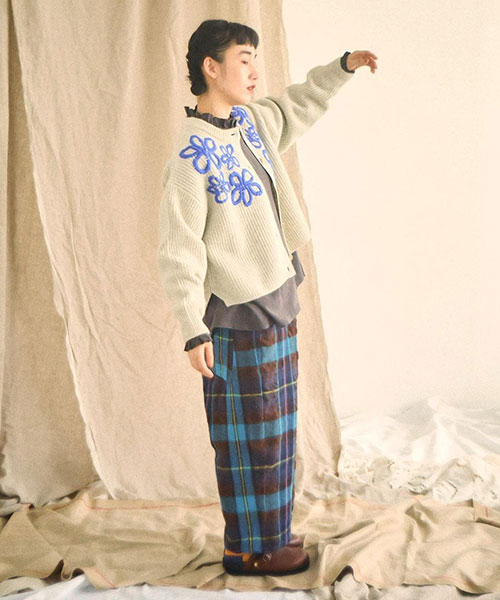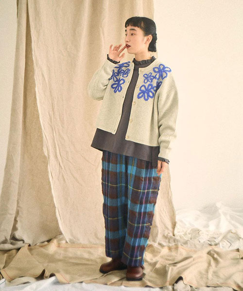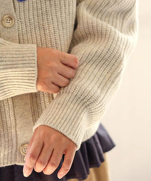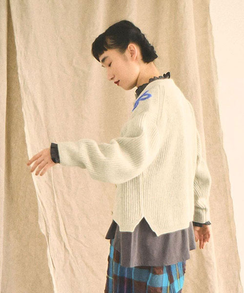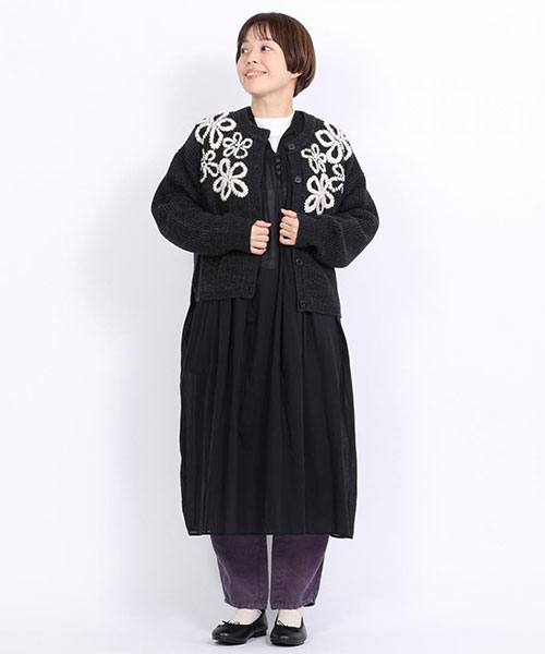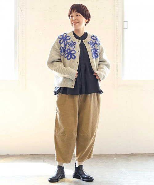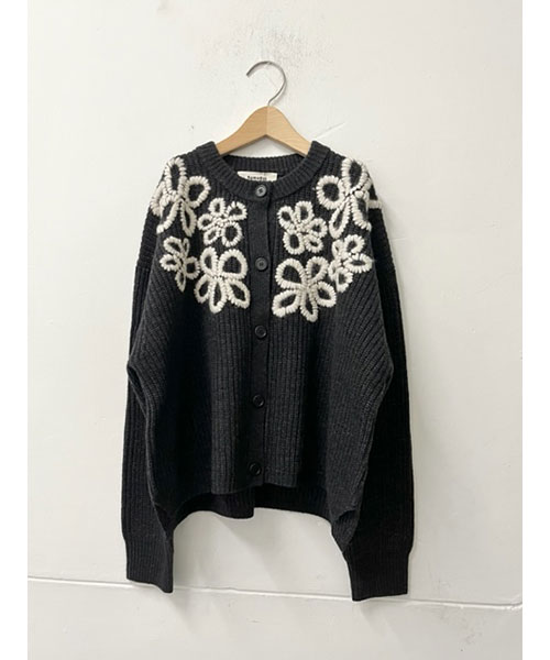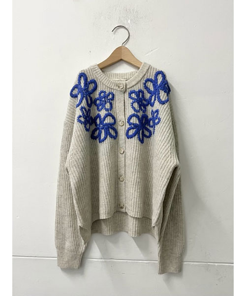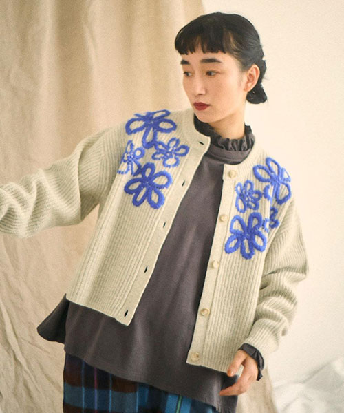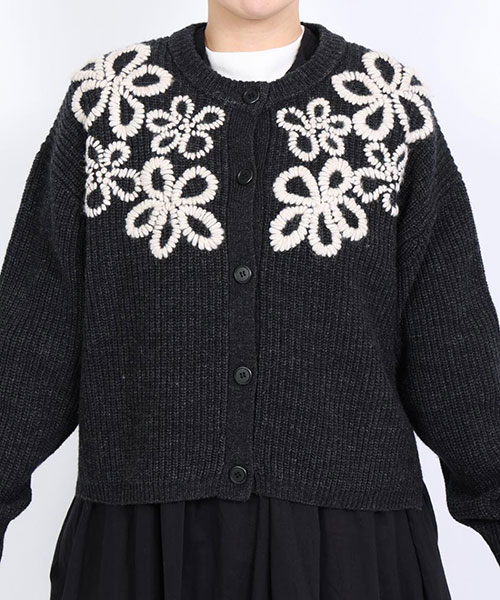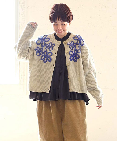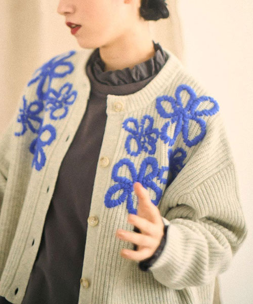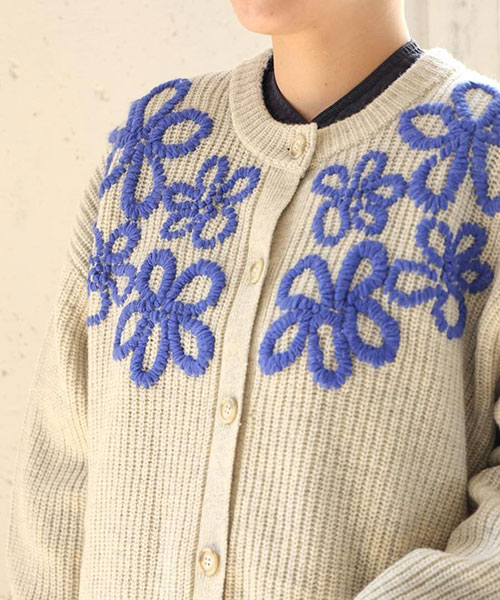 手仕事のフラワー刺繍が目を引く、ふっくら暖かなニットカーディガン。ラムウール混のふっくらとした糸を、ざっくりとした畦編みで編み立てています。