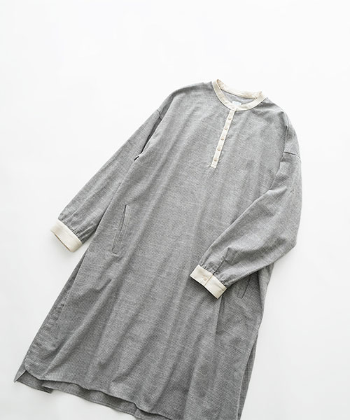 コットン素材でリラックス感のある長袖ロングシャツ。襟元はスタンドカラー仕立てで、ほど良いきちんと感を演出します。