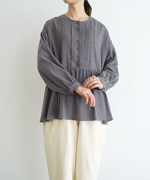 胸元のビーズとピンタックが目を惹くブラウス。ウエストの切り替えからはたっぷりとギャザーが施されており、風にふんわりなびくシルエットに。