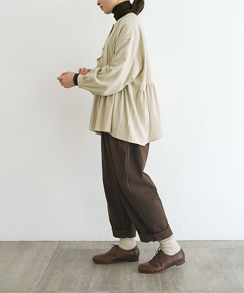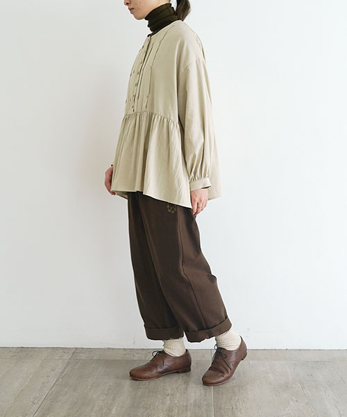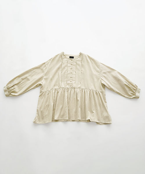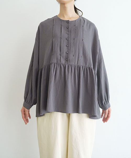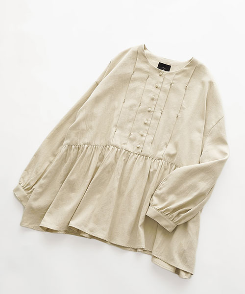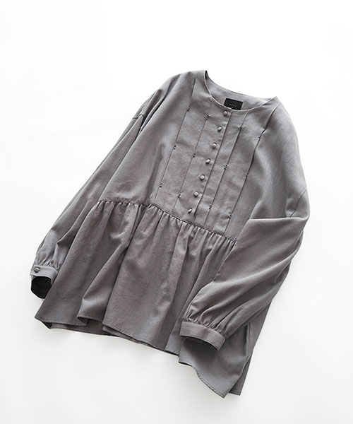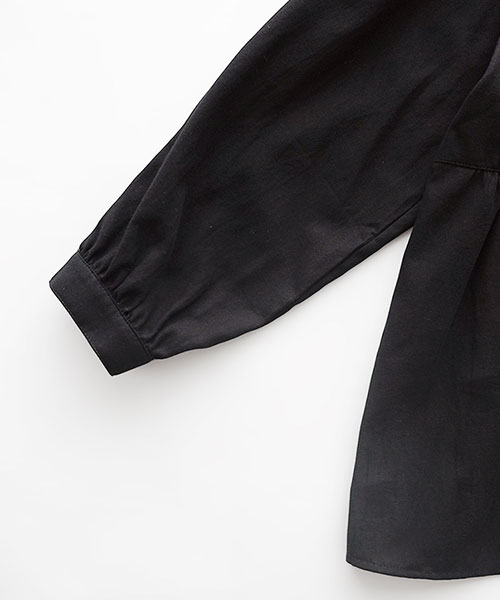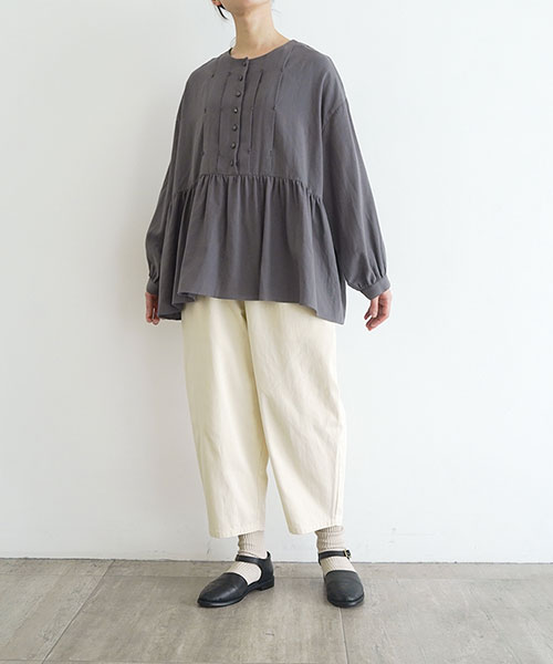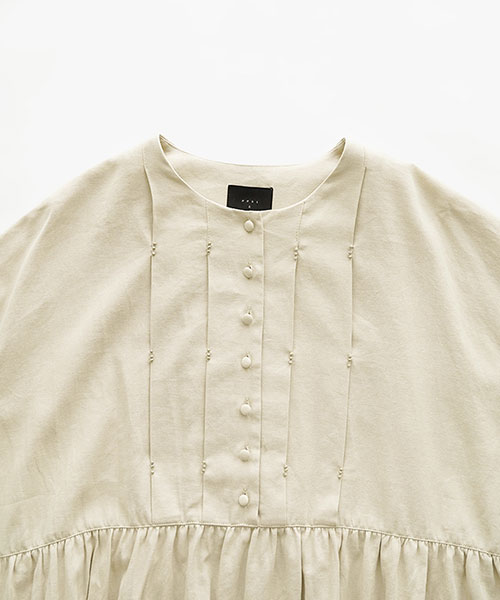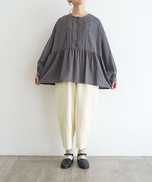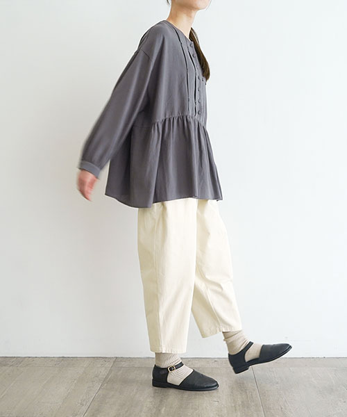 ウエストの切り替えからはたっぷりとギャザーが施されており、風にふんわりなびくシルエットに。