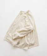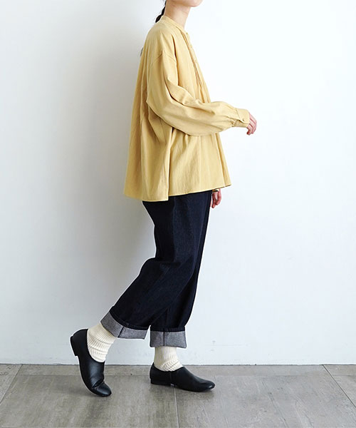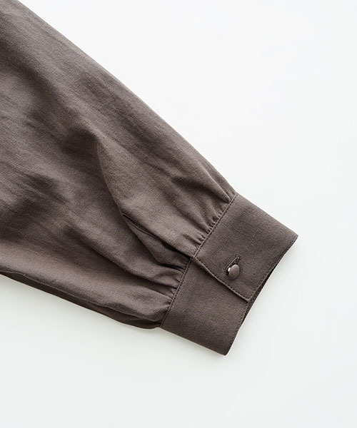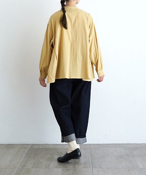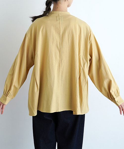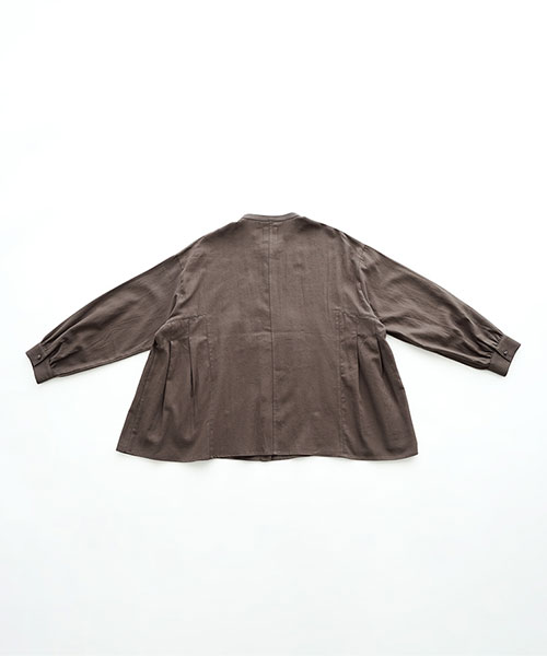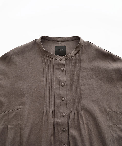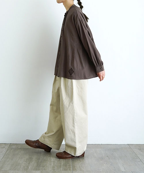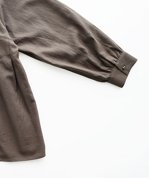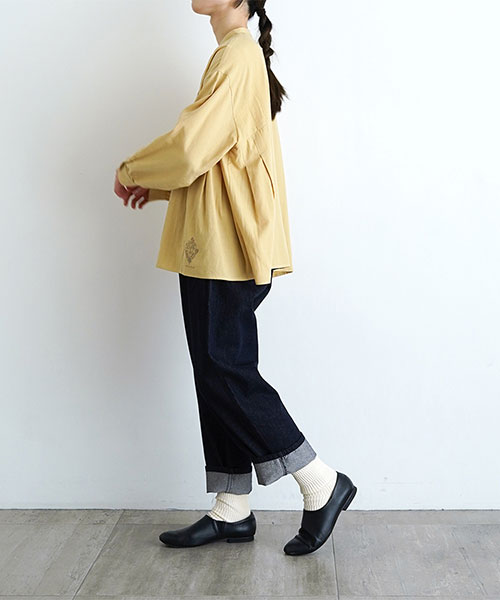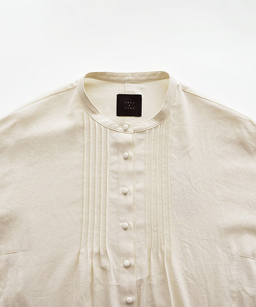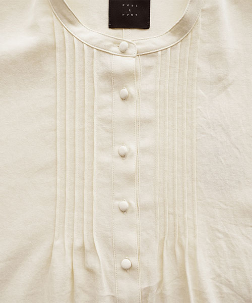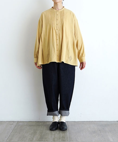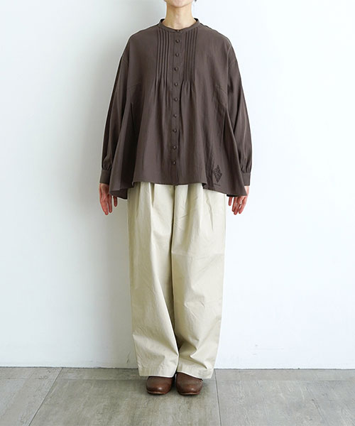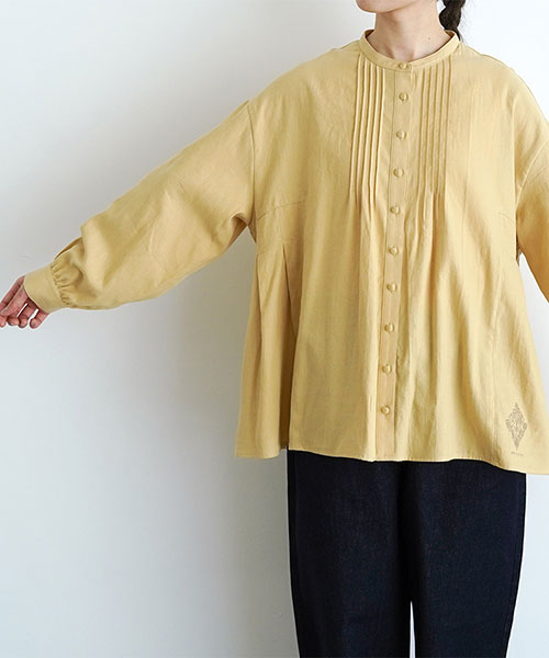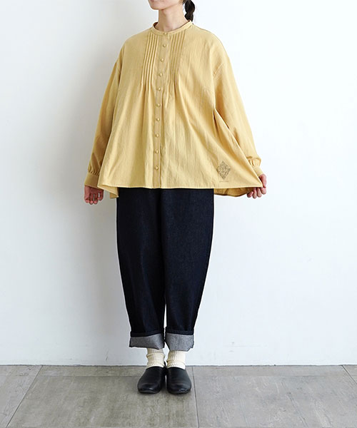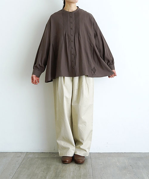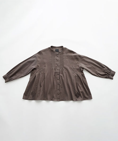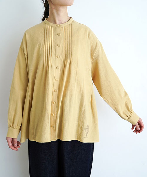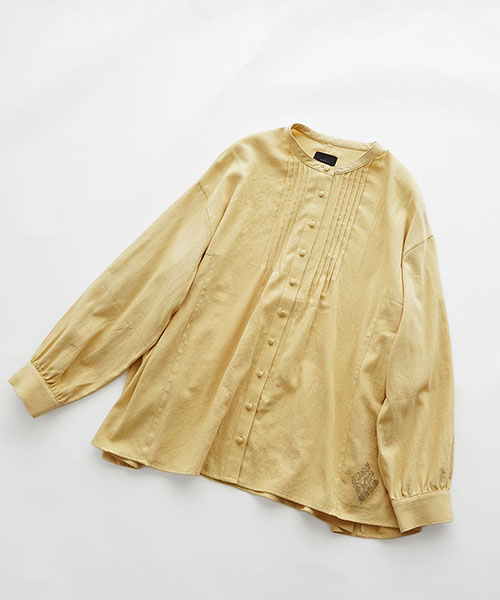 ふんわりと揺れる、刺繍ロゴがアクセントのピンタックブラウス。繊細なピンタックとくるみボタンが顔周りをすっきりと引き立て、裾に向かって自然に広がるシルエットが美しいラインを作り出します。