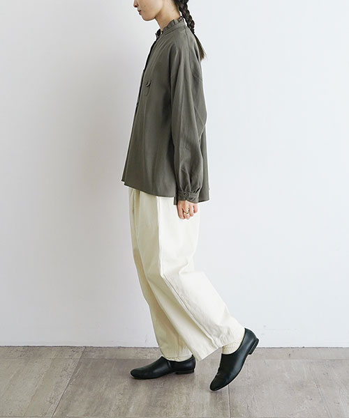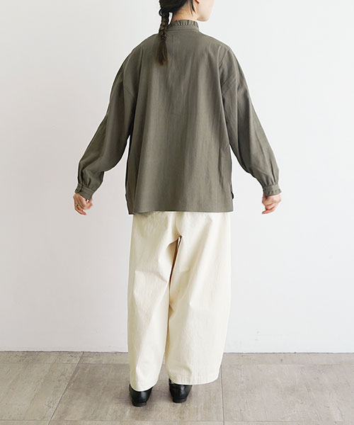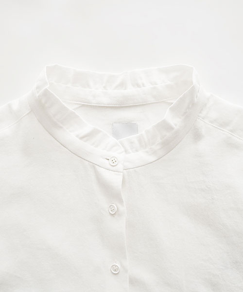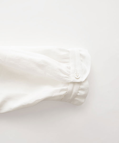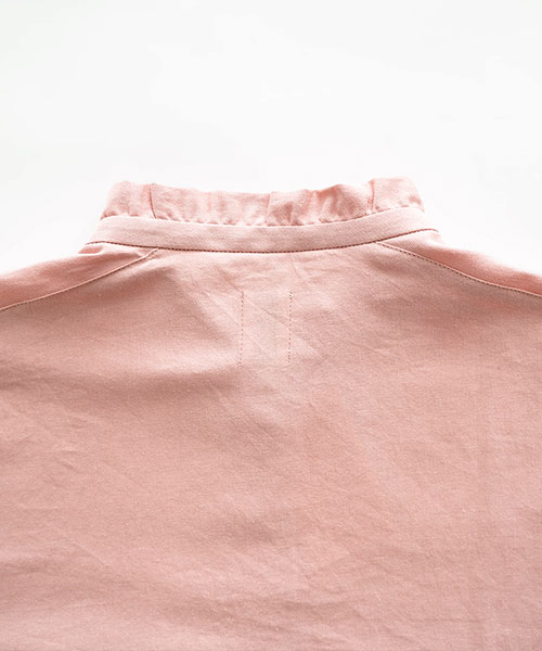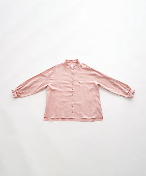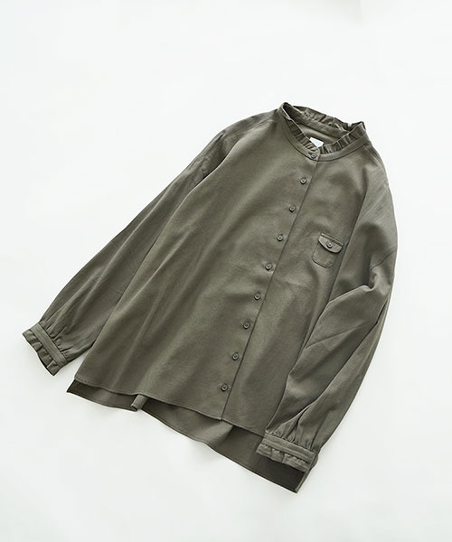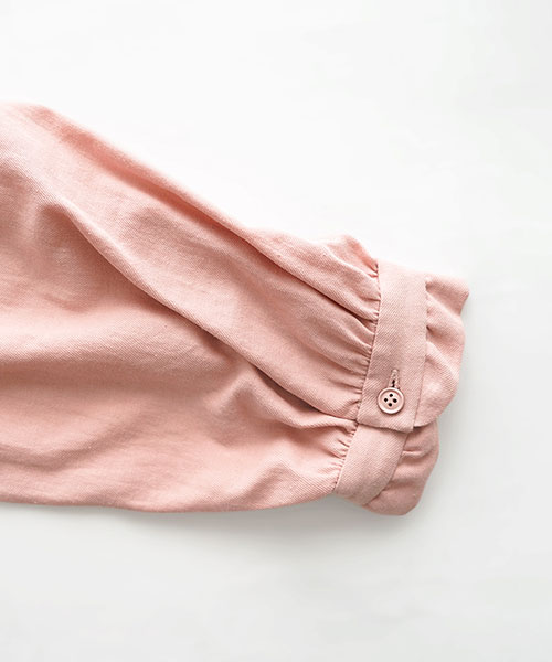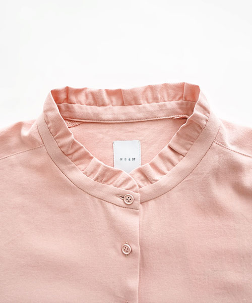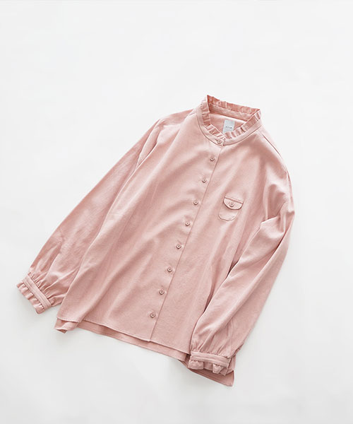 襟元と袖口にあしらわれたフリルが特徴的なブラウス。肌あたりのよいコットン素材でお作りしており、季節を問わず活躍します。