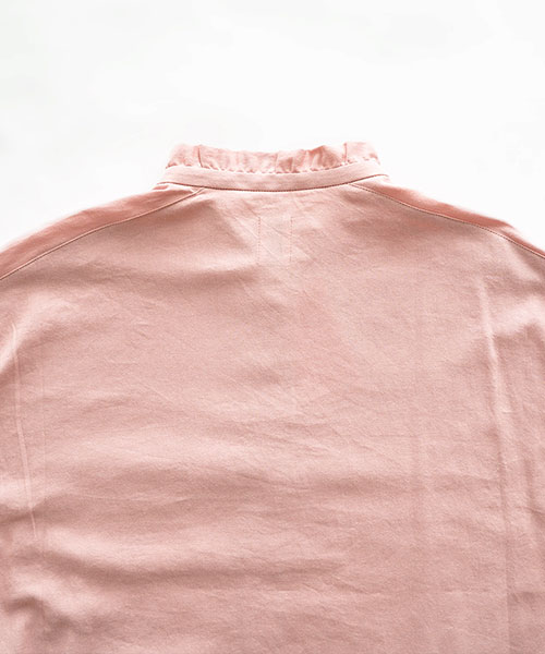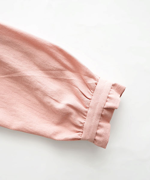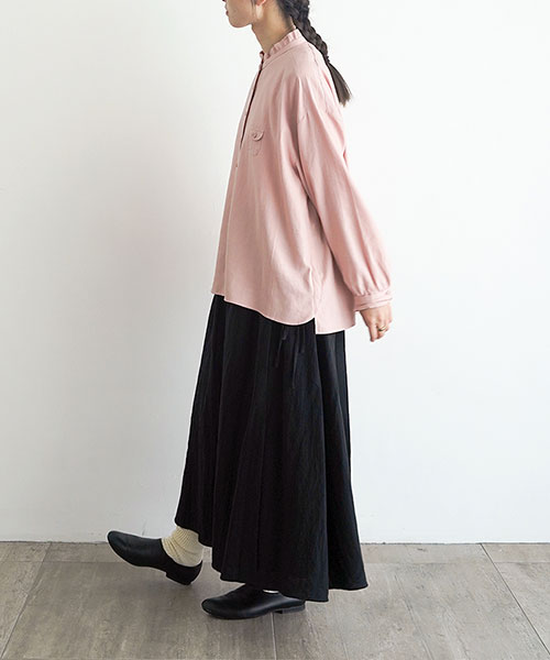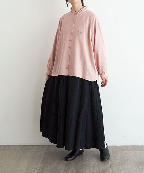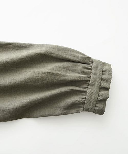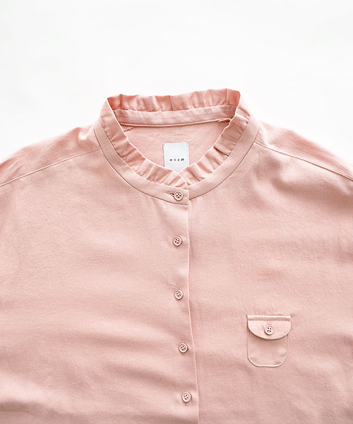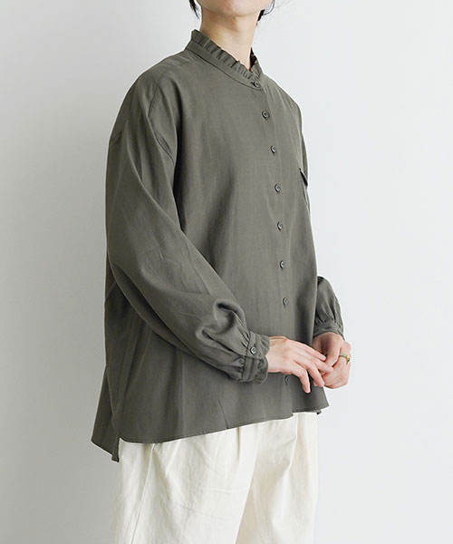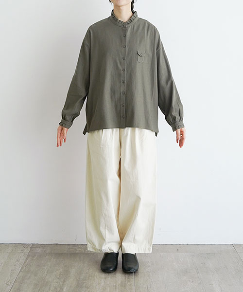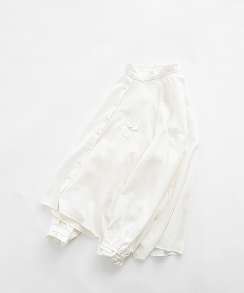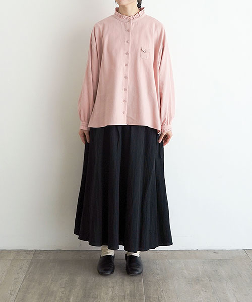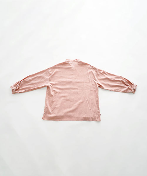 襟元と袖口にあしらわれたフリルが特徴的なブラウス。肌あたりのよいコットン素材でお作りしており、季節を問わず活躍します。