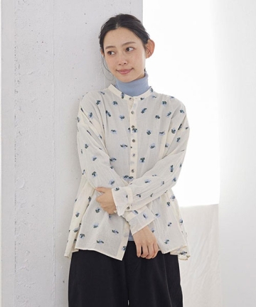 100/2 ムジ&ストライプクロス フリル衿ワイドブラウス
