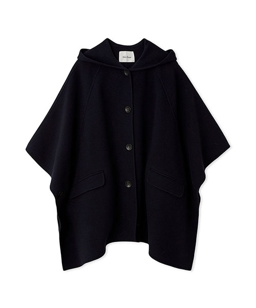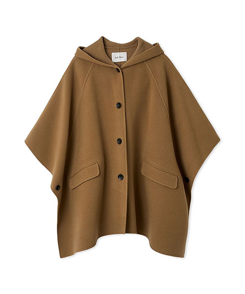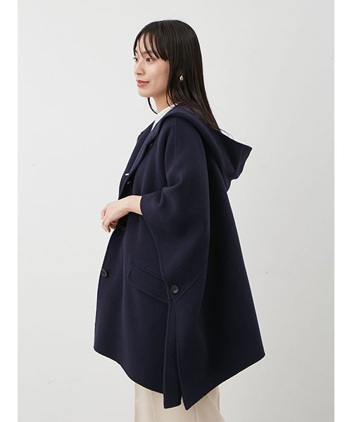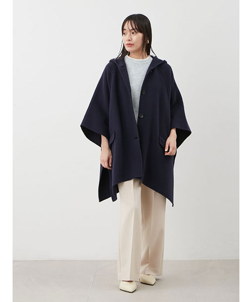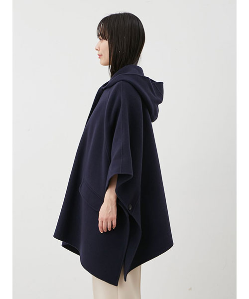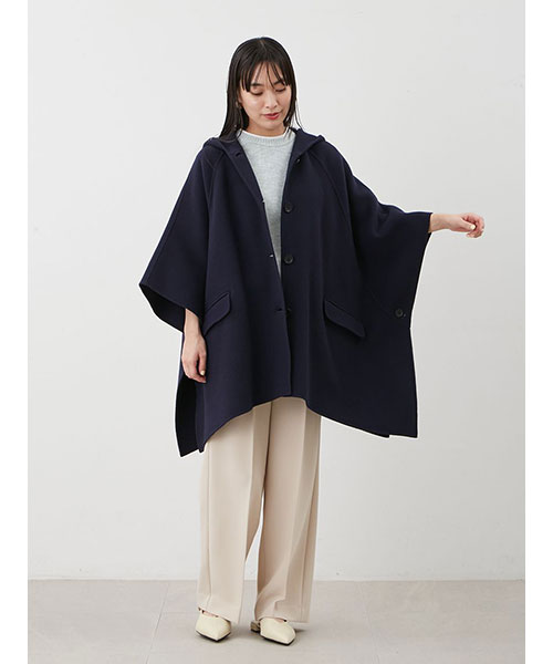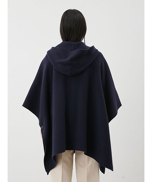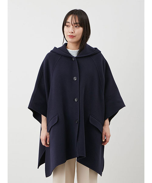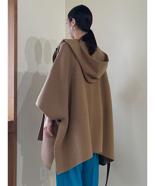 ポンチョ型に合わせてフードは大きめに設定しているので、バランスよく見えます。また、ポケットもついているので便利です。