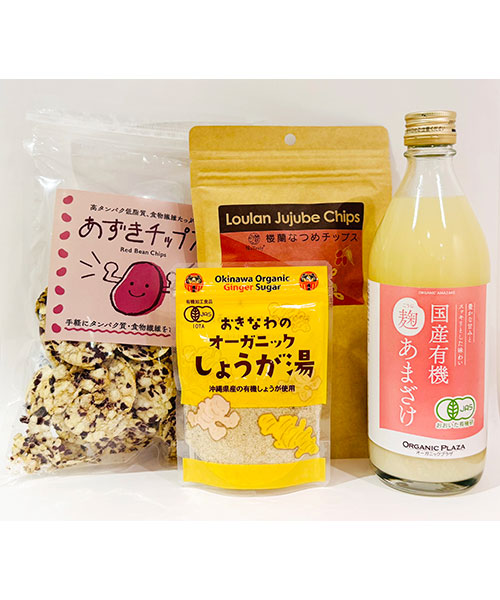 やさしい甘さの有機甘酒、グルテンフリーの小豆チップス、女性にうれしいスーパーフードなつめチップス、冷え対策にオーガニック生姜湯を詰め合わせました。心と体をいたわるひとときをどうぞ。