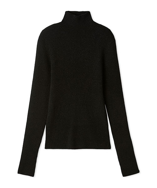 メリノウールにシルクをブレンドした糸を編み立てラメを引きそろえたホリデーシーンにもデイリーにも使えるハイネックリブニットトップス。
