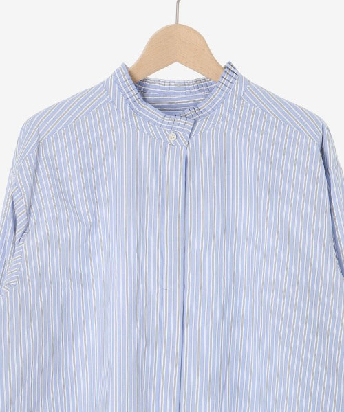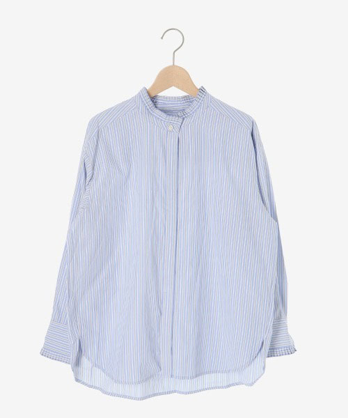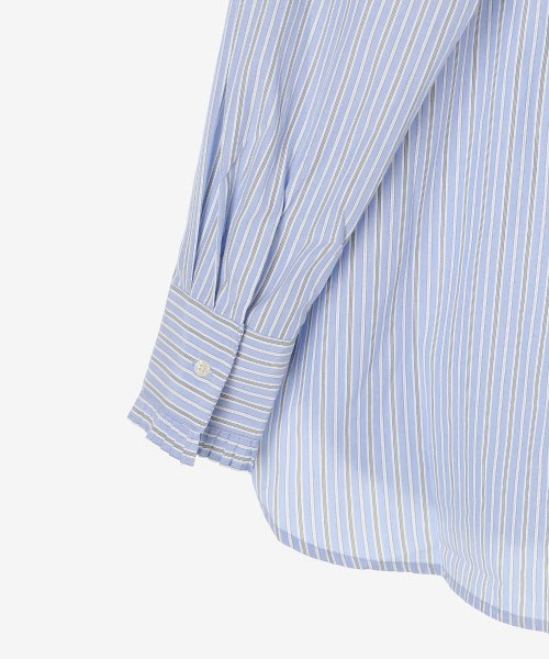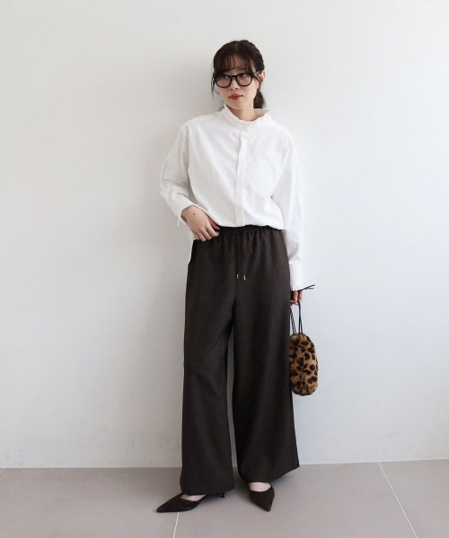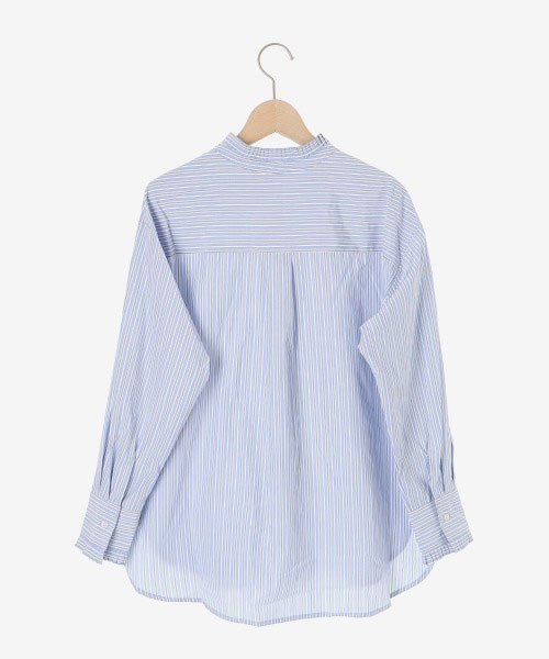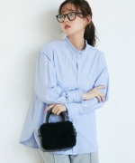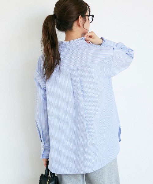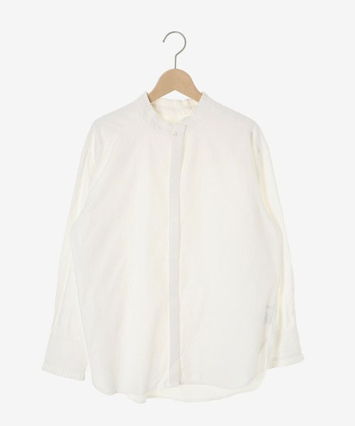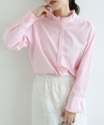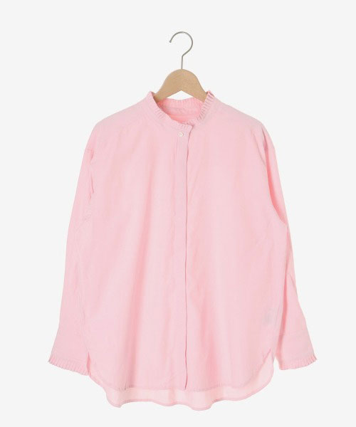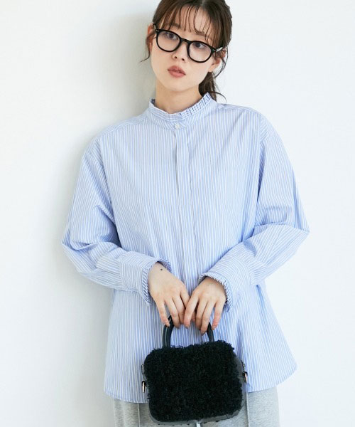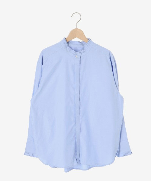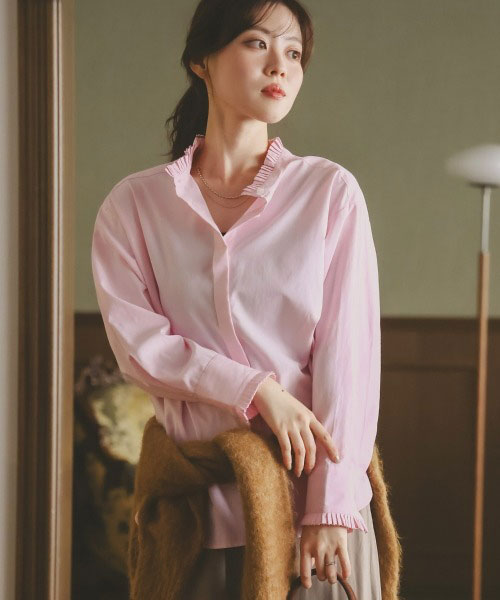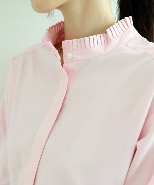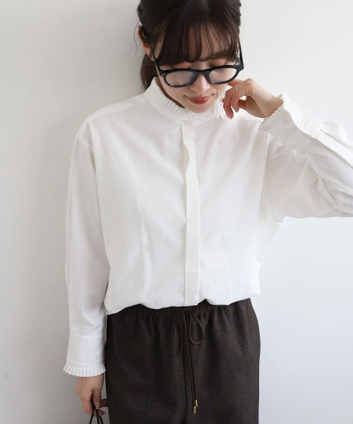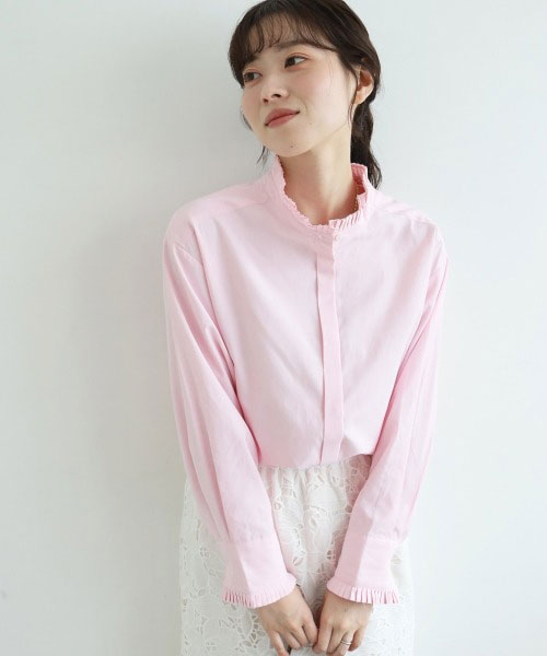 襟元と袖口にあしらったプリーツがポイントのシャツ。