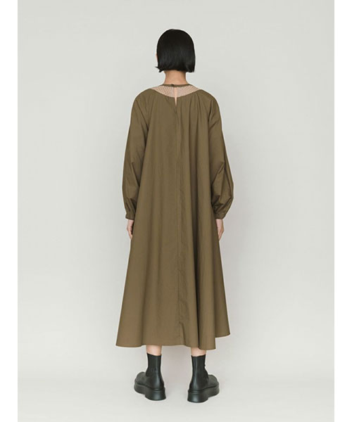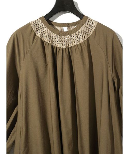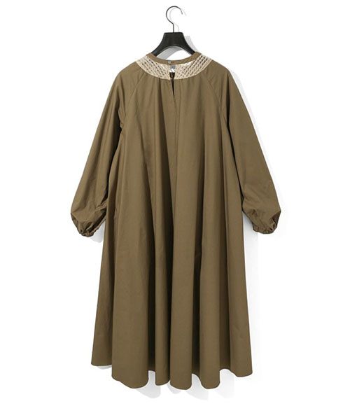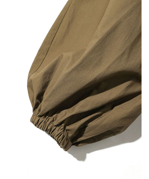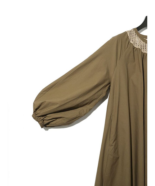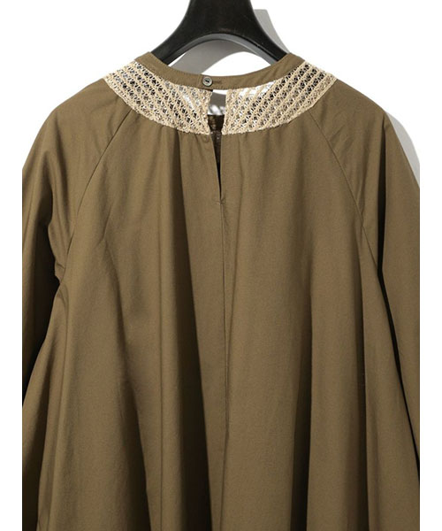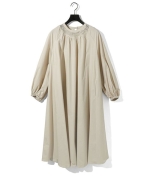 広がりのあるボリューム感のあるフレアラインが女性らしい雰囲気を印象付けます。袖口はゴム使いなので、袖をまくるとフンワリとしたボリュームのある袖を表現できます。バックネックにはボタンが付いているので着脱のしやすいデザイン。