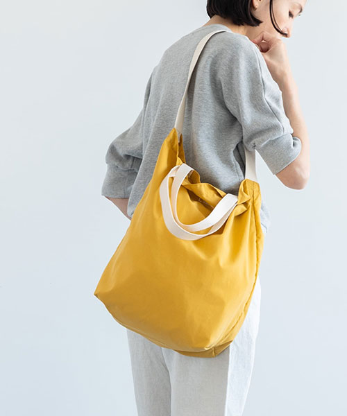 ショルダーは、肩から下げて使いやすい長さ。ナチュラルな雰囲気の綿の持ち手とショルダーが、ナイロンのカジュアルさを中和しています。ナイロン素材の中でも薄く軽い生地のため、小さく折り畳むことができ、サブバッグがわりに持ち歩くのもよさそうです。