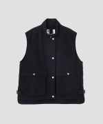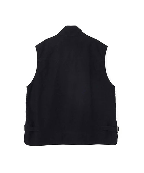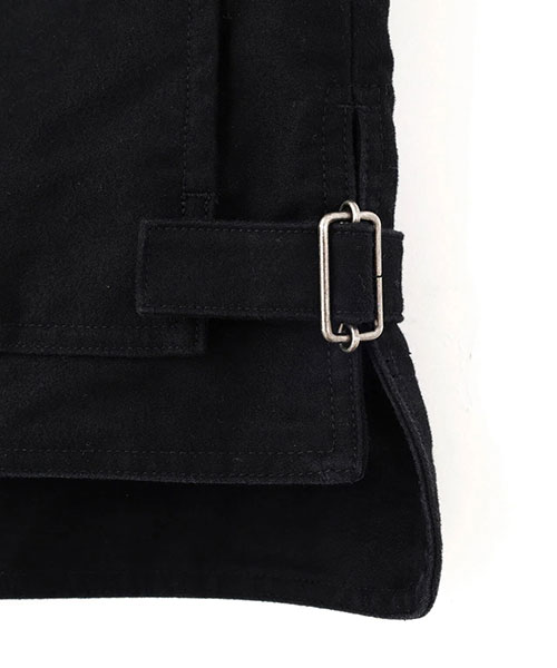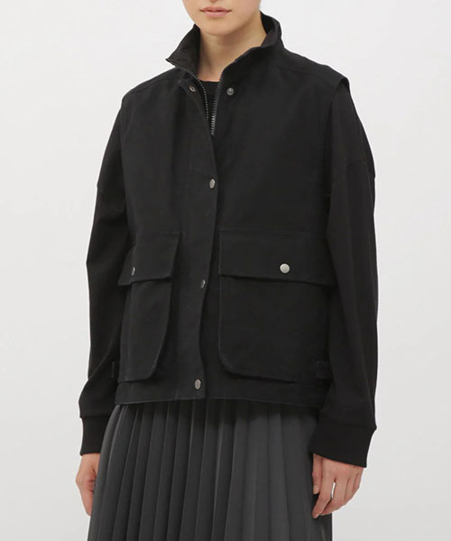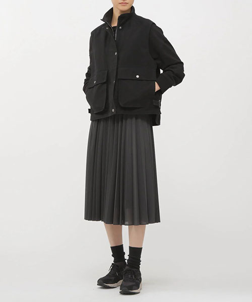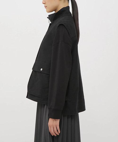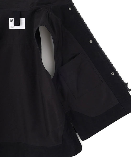 サイドと上から使える大きなベローズポケット、前後差をつけた裾のアジャスター、ドットボタンとジップを組み合わせたフロントなど、印象的なディテールを取り入れた存在感のある一着。