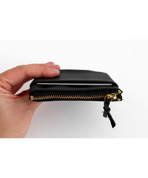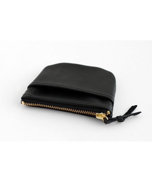 マチのないフラットな形。外側にポケットがひとつ。ファスナーのゴールドが輝きを添えています。ファスナー金具には本体と同じ革の引き手が付いているのでつまみやすく便利です。