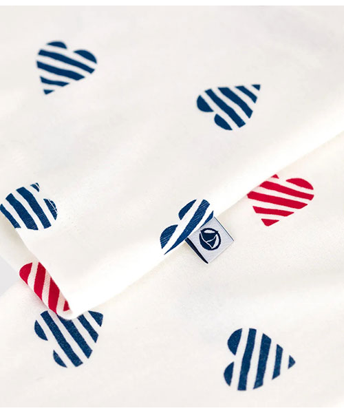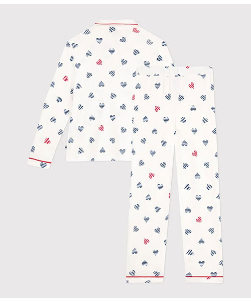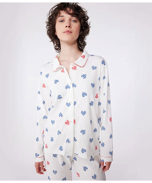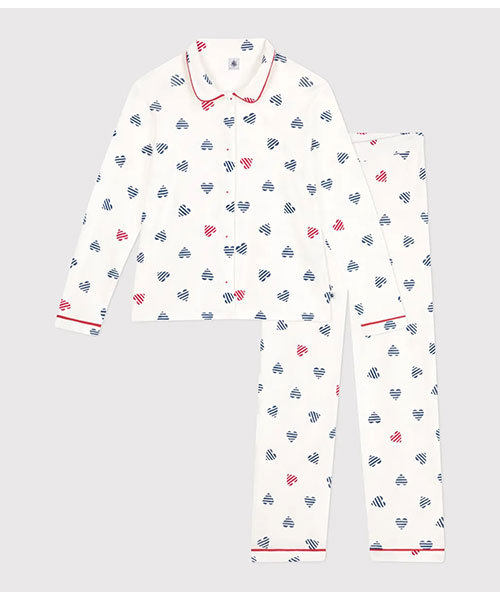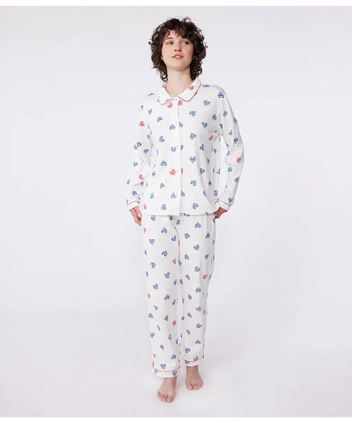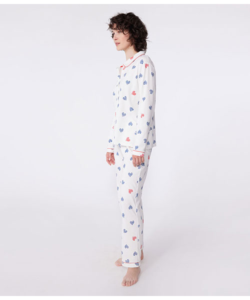 ボーダー柄のハートプリントがキュートな長袖パジャマです。環境にやさしく、第二の肌と呼ばれるほどやわらかな1x1リブ編み素材を使用しナチュラルな着用感を実現しています。お家でのリラックスタイムから就寝時までを快適に過ごせる、おすすめのアイテムです。