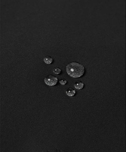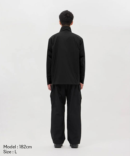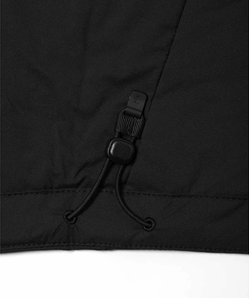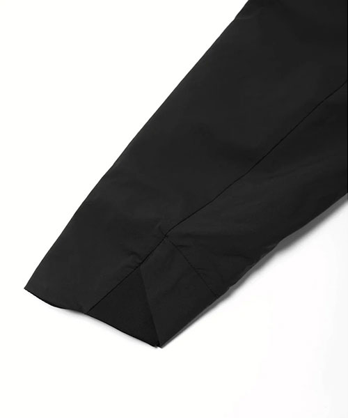 中わたには複数の特殊な3Dスパイラル原糸構造がそれぞれ複雑に絡み合うことで、かさ高性による温かさ、ストレッチ性、通気性をもつ3DeFXを内蔵。はっ水加工は自然界で分解されにくいフッ素加工物を一切使用しないC0はっ水機能を採用。