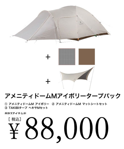 アイボリーカラー統一されており、大自然に映える上質なキャンプシーンを演出します。高品質かつ高いコストパフォーマンスを誇る3~4名用のベストセラ-テント、アメニティドームMアイボリーとオプションのインナーマット、グランドシート。さらに、難燃性のインナールーフを備えた、焚火対応タープ「TAKIBIタープ ヘキサ Mセット」の便利でお得なセットです。